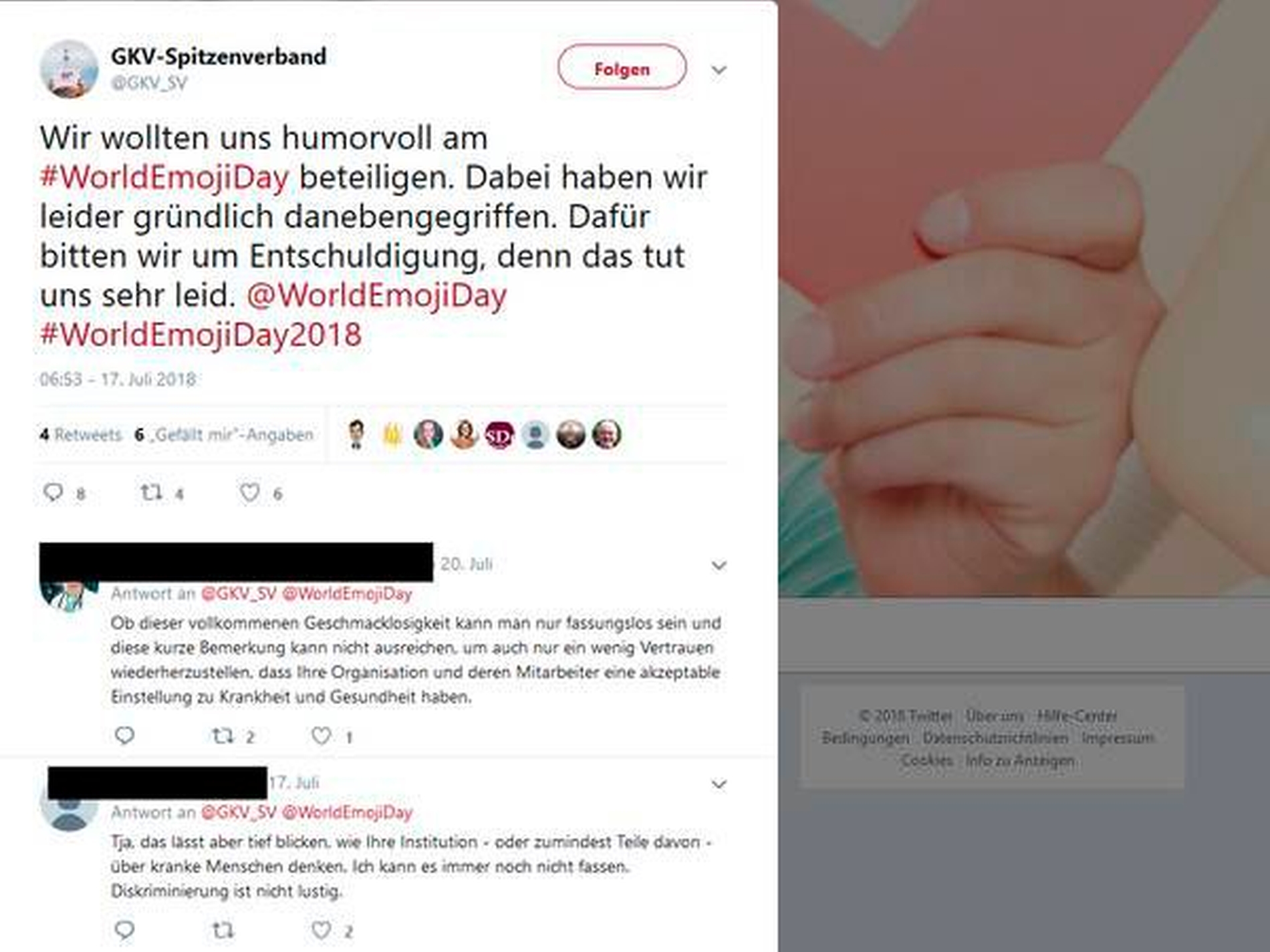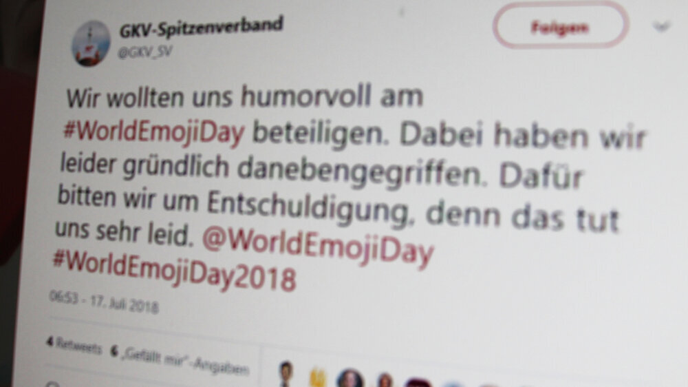 "Wir wollten uns humorvoll am #WorldEmojiDay beteiligen", erklärte sich der GKV-Spitzenverband, nachdem er die Emoji-Liste auf Twitter gelöscht hatte. "Dabei haben wir leider gründlich danebengegriffen. Dafür bitten wir um Entschuldigung, denn das tut uns sehr leid."