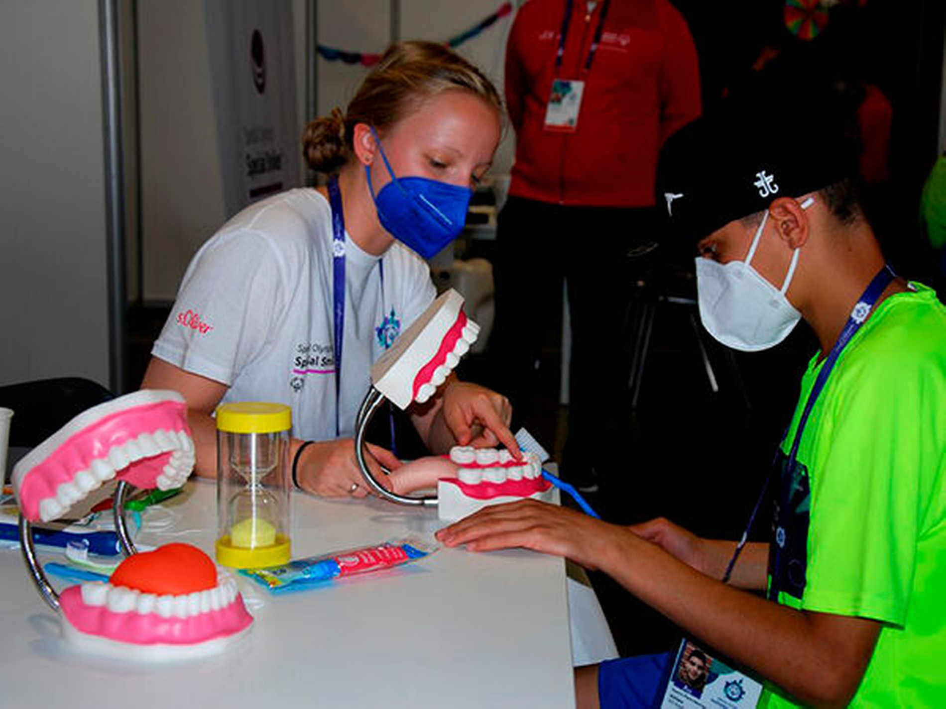 Dr. Christoph Hils, der Clinical Director von „Special Smiles” erklärte, wie das Programm diesmal angepasst werden musste: Untersuchungen der Athleten wie gewohnt waren nicht möglich. Der sonst so beliebte „Putzbrunnen” konnte nicht aufgebaut werden, auch der „Kariestunnel” als interaktives Tool fiel weg. „Dafür haben wir unseren Fokus auf das Beratungsprogramm gelegt und an Modellen geübt.”