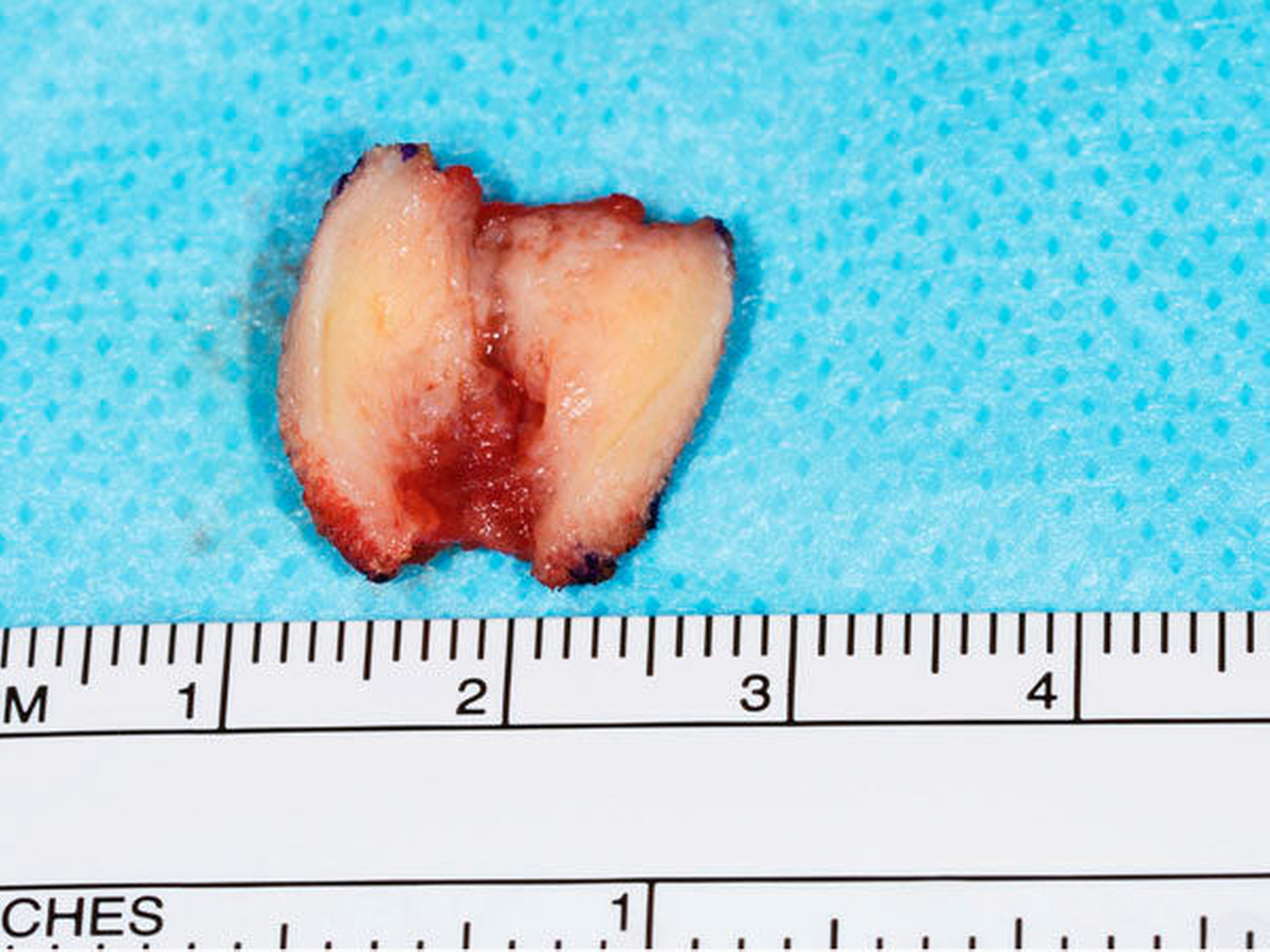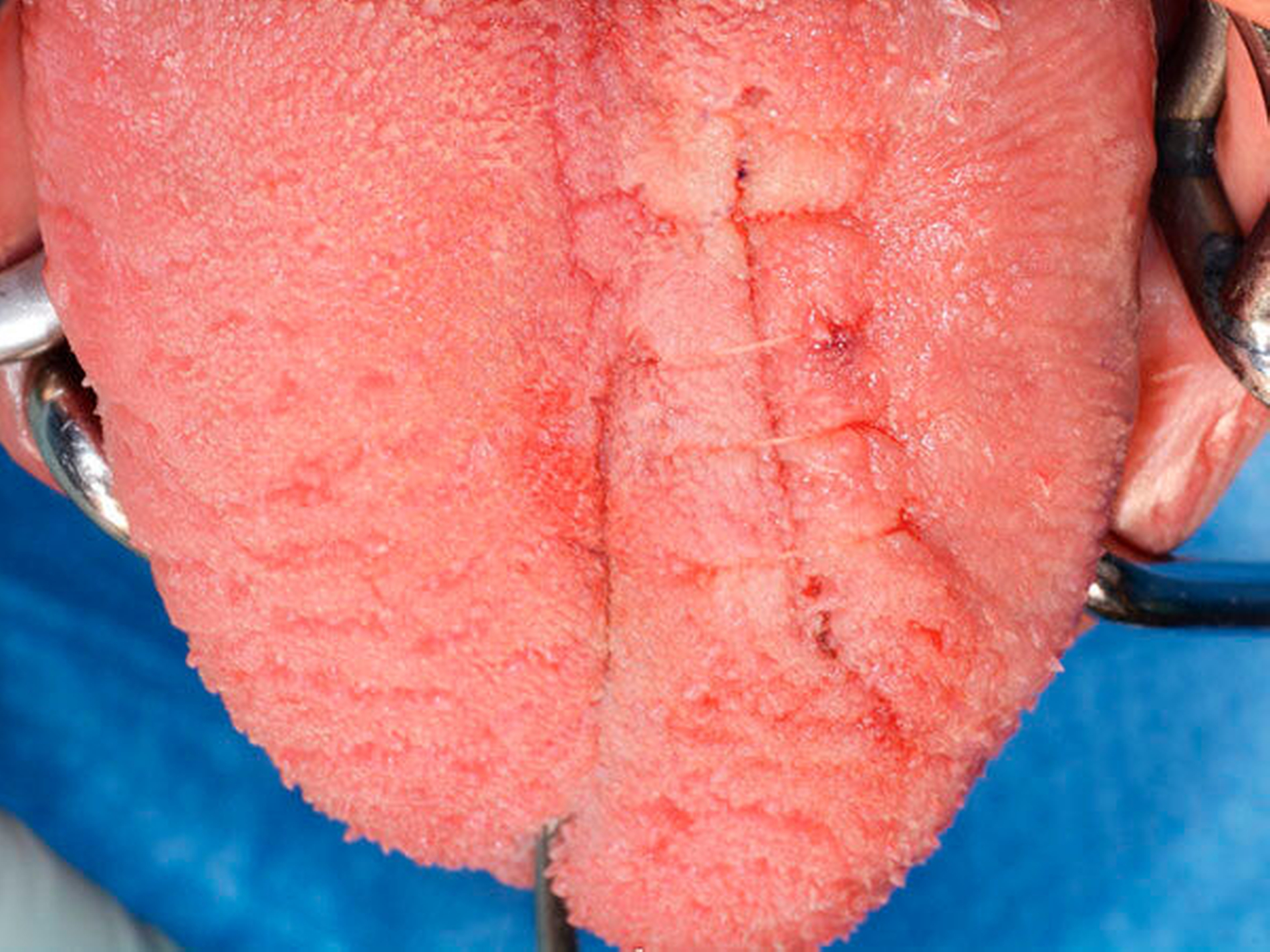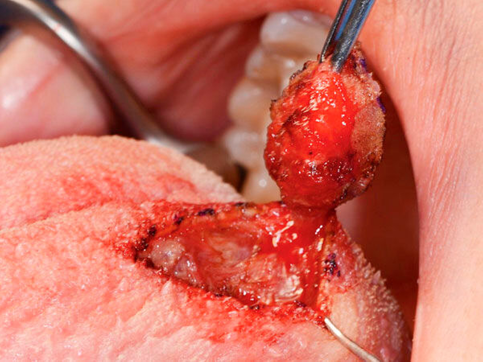 Die vom Hausarzt überwiesene Patientin stellte sich mit einer knotigen Struktur unterhalb der unversehrten Zungenmukosa des linken mittleren Zungenrückens vor (Abbildung 1). Der Knoten war derb palpabel, nicht verschieblich und weder in Ruhe noch auf Druck dolent. Bis auf den erhabenen Aspekt beschrieb sie keinerlei Beschwerden. Im MRT stellte sich in Projektion auf die linke Zunge submukös eine vorwiegend unscharf begrenzte, etwa 10 mm x 8 mm messende, Kontrastmittel-aufnehmende Struktur dar. Es gab keinen Anhalt für weitere Raumforderungen oder Lymphknotenvergrößerungen (Abbildungen 2 und 3). Da von einem benignen Tumor ausgegangen wurde, erfolgte im Rahmen einer kurzen Intubationsnarkose die In-toto-Exzisionsbiopsie mit knappem Sicherheitsabstand. Der intraoperative Situs zeigte, wie schon nach der initialen Bildgebung vermutet, eine unscharf begrenzte, solide, in die Zungenmuskulatur hineinreichende Raumforderung mit weißlich-gelblicher Färbung der Schnittfläche (Abbildungen 4 und 5). Nach Resektion und ausgiebiger Blutstillung konnte die Wunde primär mit resorbierbaren Fäden verschlossen werden (Abbildung 6).