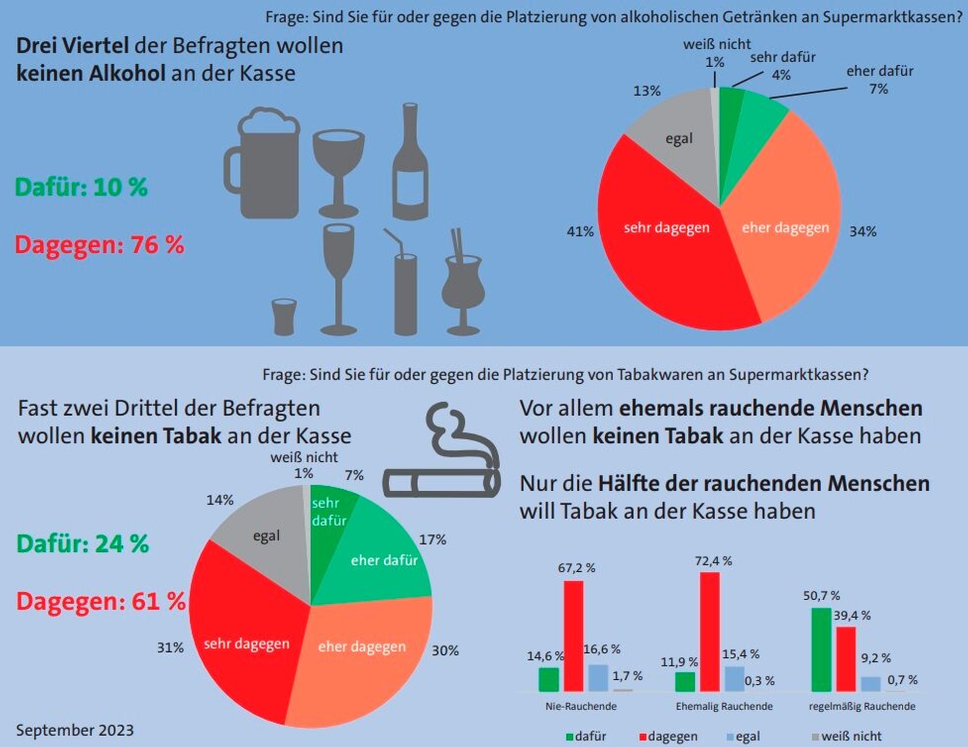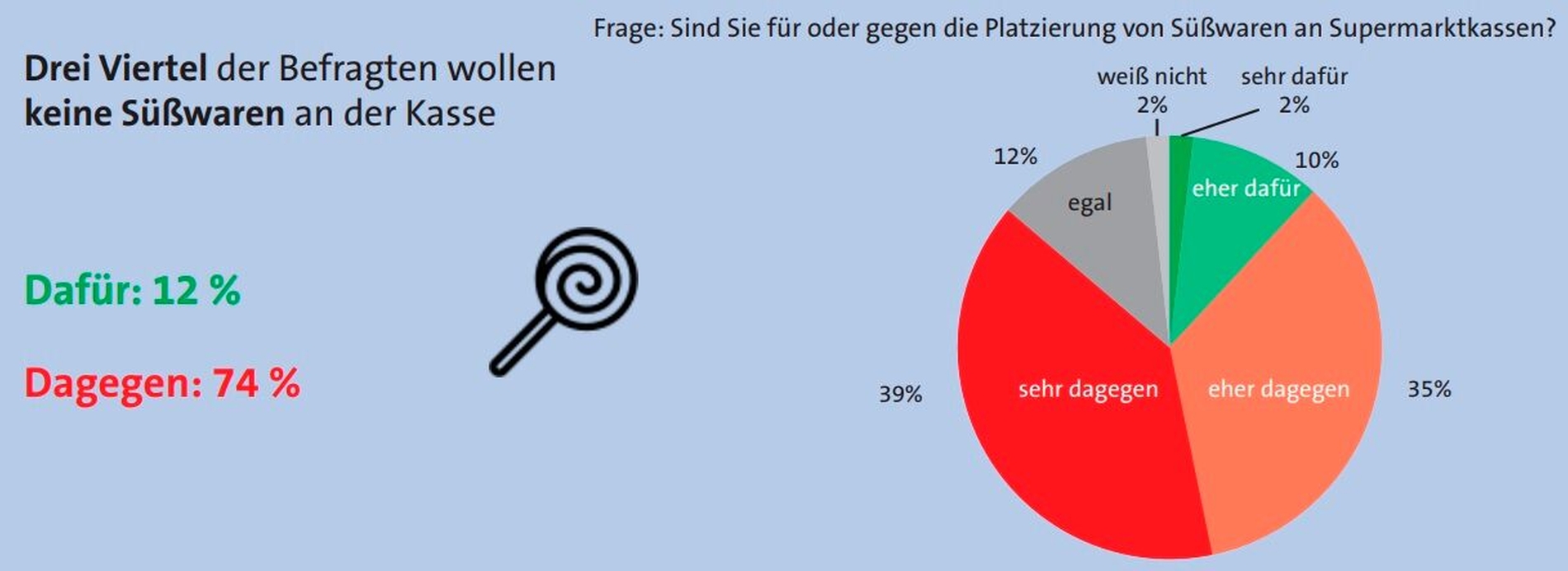 Jetzt zeigt eine repräsentative Umfrage im Auftrag des Deutschen Krebsforschungszentrums (DKFZ) und der Deutschen Allianz Nichtübertragbare Krankheiten (DANK), dass eine große Mehrheit der Deutschen die Platzierung von Alkohol, Tabak und Süßwaren in der Kassenzone von Supermärkten ablehnt. Konkret sprechen sich drei Viertel der Befragten dafür aus, dass Supermärkte Alkohol und Süßwaren nicht im Kassenbereich platzieren.