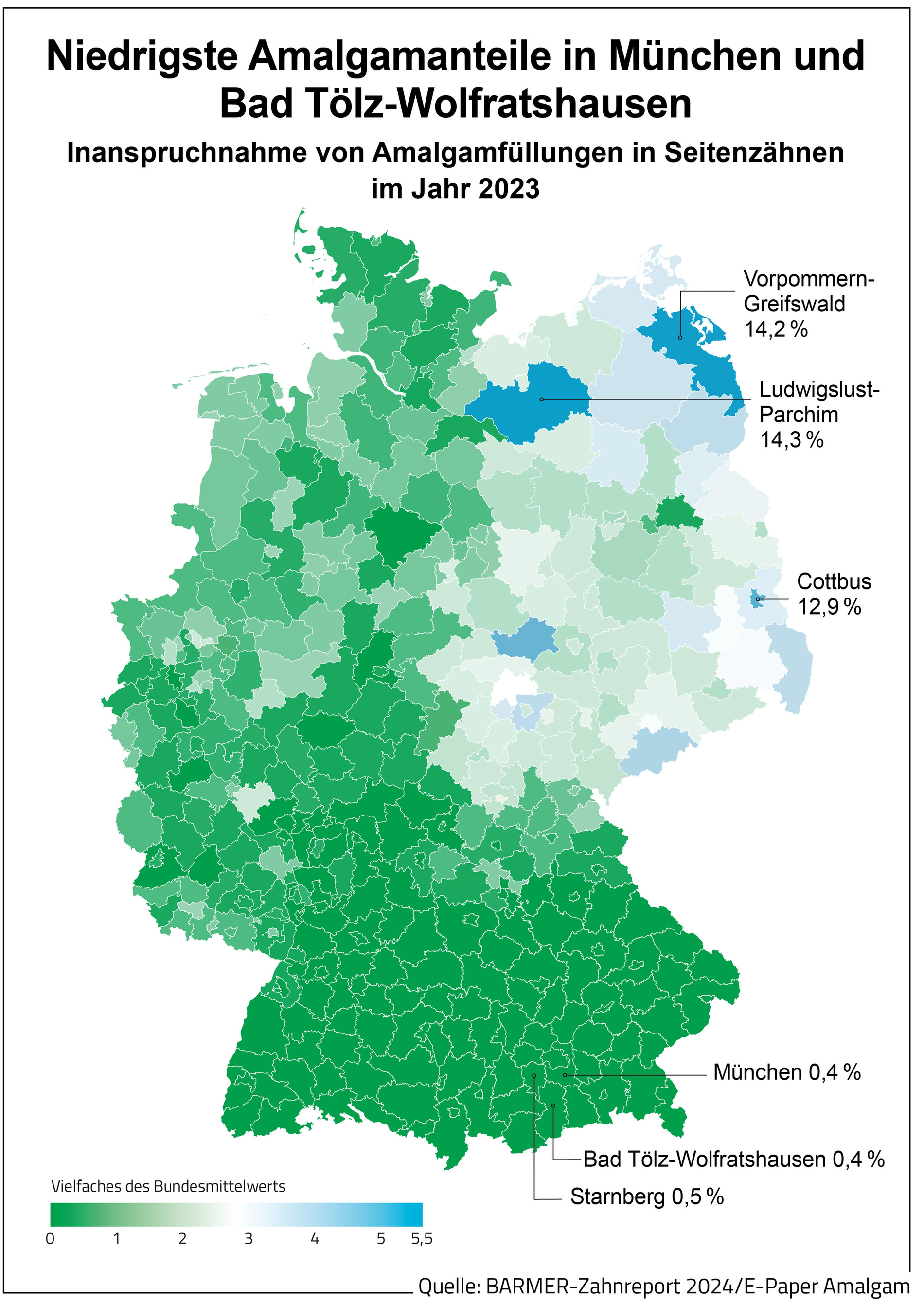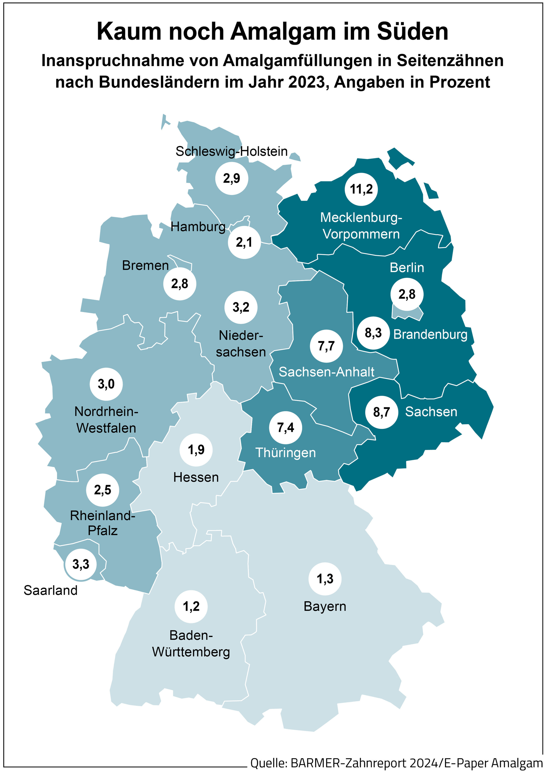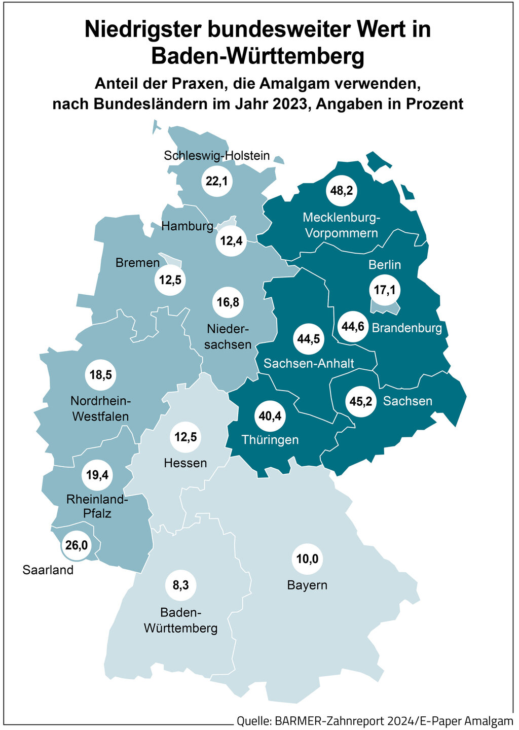 Nach den Daten der BARMER lag der bundesweite Anteil der Praxen, die mindestens eine Amalgamfüllung abrechneten, bei knapp 20 Prozent. Die regionalen Anteile der Praxen mit Amalgamverwendung reichen für das Jahr 2023 von 8,3 Prozent in Baden-Württemberg bis hin zu 48,2 Prozent in Mecklenburg-Vorpommern.