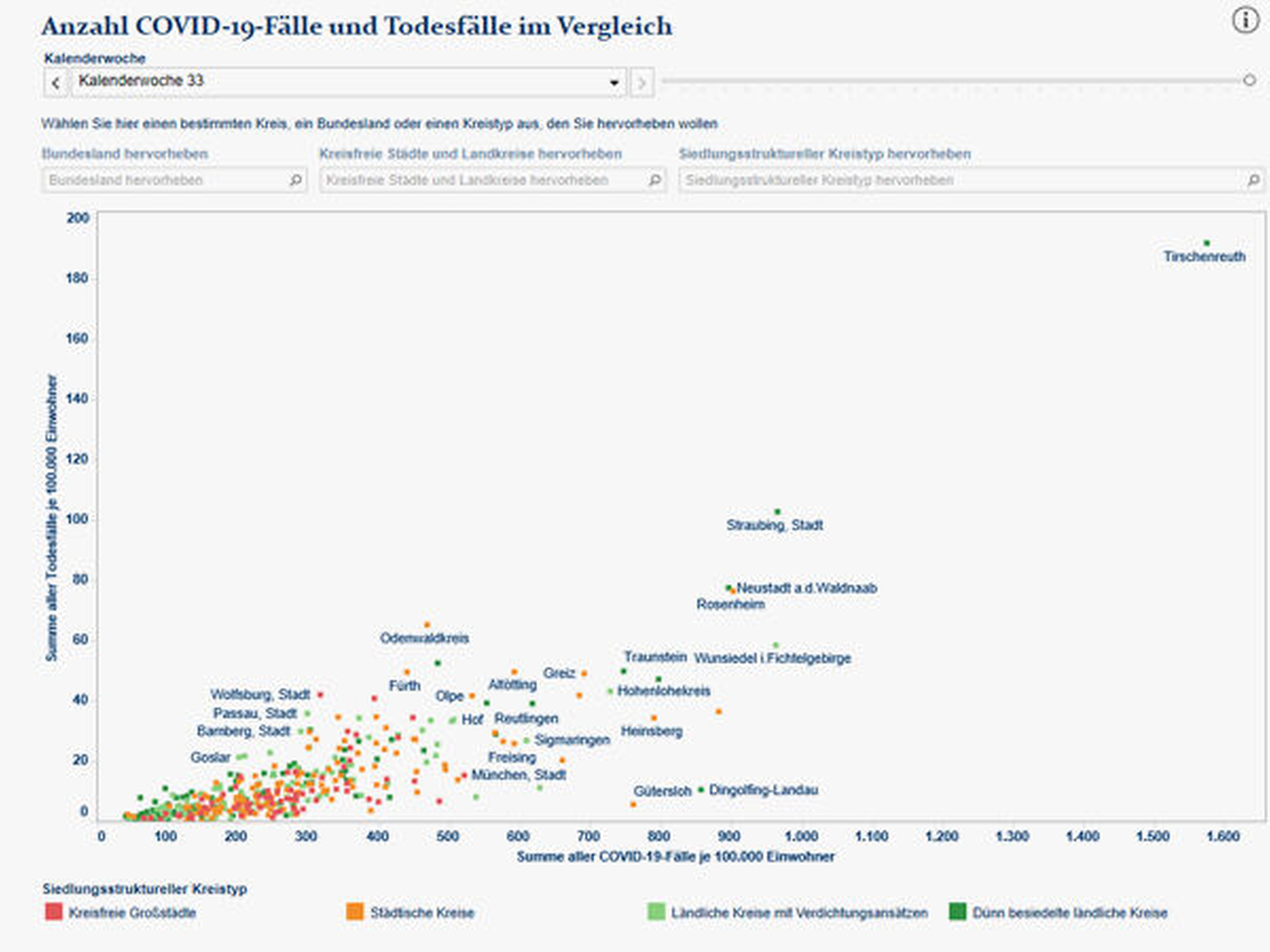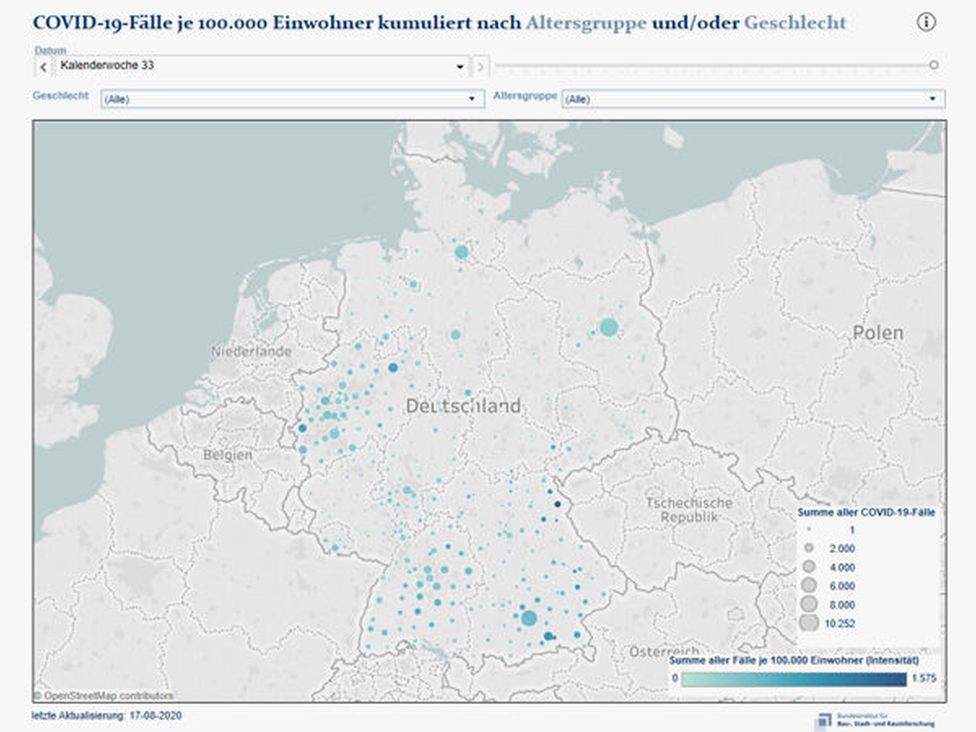 Fazit des BBSR: "Die Ausbreitung von COVID-19 lässt sich nicht explizit auf bestimmte räumlichen Muster zurückführen. Vielmehr spielen individuelle Bedingungen, lokale Ereignisse und Einzelevents eine entscheidende Rolle." Erschließen ließe sich dies theoretisch nur durch einen multifaktoriellen Ansatz, der jedoch einen längerfristig geplanten Forschungsansatz erfordere.