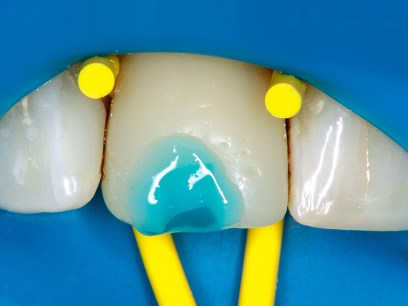Das Bondingsystem wird non-selektiv angewendet, das heißt auf dem Primärkomposit in gleicher Weise wie auf Schmelz und Dentin. Die Ätzung mit Phosphorsäure kann sich wegen der damit eventuell verbundenen Reinigungswirkung günstig auf den Komposit-Komposit-Verbund auswirken, so dass Etch-and-Rinse-Systeme möglicherweise vorteilhaft sind. Dies gilt auch immer dann, wenn eine maximale Schmelzhaftung mit dauerhaft verfärbungsfreien Schmelzrändern angestrebt wird. Nach Einwirkung der Phosphorsäure (Schmelz und Komposit: 30 Sekunden, Dentin: maximal 15 Sekunden) wird die Reparaturstelle gründlich mit Wasserspray gespült und anschließend mit Druckluft getrocknet. Die Applikation eines Mehrschrittsystems (Primer und Adhäsiv) beziehungsweise eines Universaladhäsivs erfolgt nach Herstellerangaben und schließt mit der Lichthärtung des Adhäsivs.