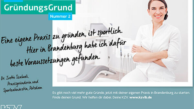 Dr. Ivette Szabadi, ist Praxisgründerin und Sportzahnärztin aus Potsdam – und eines der sechs Beispiele, die in der Plakataktion porträtiert werden. Sie verweist darauf, dass die KZV Land Brandenburg ihr bei ihrer Praxissuche sehr weitergeholfen habe. Nach dem Ende ihrer Bundeswehrzeit sei die Niederlassung für sie die logische Konsequenz gewesen. Selbstbestimmtes Arbeiten und die Möglichkeit, sich mit der Praxis selbst zu verwirklichen, seien bei der Gründung ausschlaggebend gewesen.