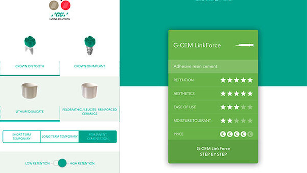 Um in dem umfassenden Portfolio stets zielgenau die richtige Lösung zu finden, bietet GC den kostenlosen GC Luting Guide an. Die innovative App ist erhältlich für Android und iOS und zeigt in wenigen Klicks Empfehlungen zu jeder Herausforderung im Bereich Befestigung.