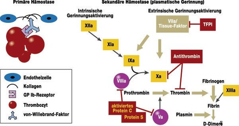 Bei der Hämostase sind zwei Teilprozesse zu unterscheiden, die primäre sowie die sekundäre Blutgerinnung. So kommt es zunächst – initiiert durch eine Verletzung im Bereich eines Blutgefäßes – zur Aktivierung von Thrombozyten, die eine Schlüsselrolle bei der Hämostase spielen. Sie setzen vasokonstringierende Botenstoffe frei, die eine Verengung des Blutgefäßes bewirken, heften sich an die Wand des verletzten Blutgefäßes und aggregieren miteinander, so dass eine Art Pfropf über der Gefäßläsion entsteht und den Austritt von Blut verhindert. Parallel zu dieser Thrombozytenaggregation, die quasi als Notfallmaßnahme der Blutstillung fungiert, kommt es zur Aktivierung der plasmatischen Gerinnung, also der sekundären Hämostase. Diese führt dazu, dass der lose Verbund der Thrombozyten gefestigt wird. An diesem Prozess sind verschiedenste Plasmaproteine, die sogenannten Gerinnungsfaktoren, beteiligt, deren Funktion wie in einer Kaskade reguliert und aufeinander abgestimmt ist.