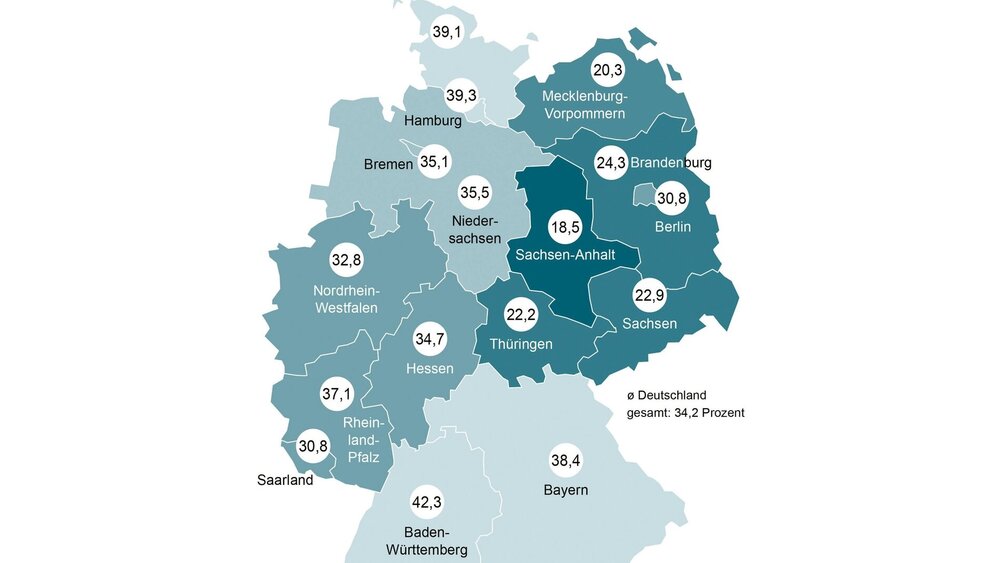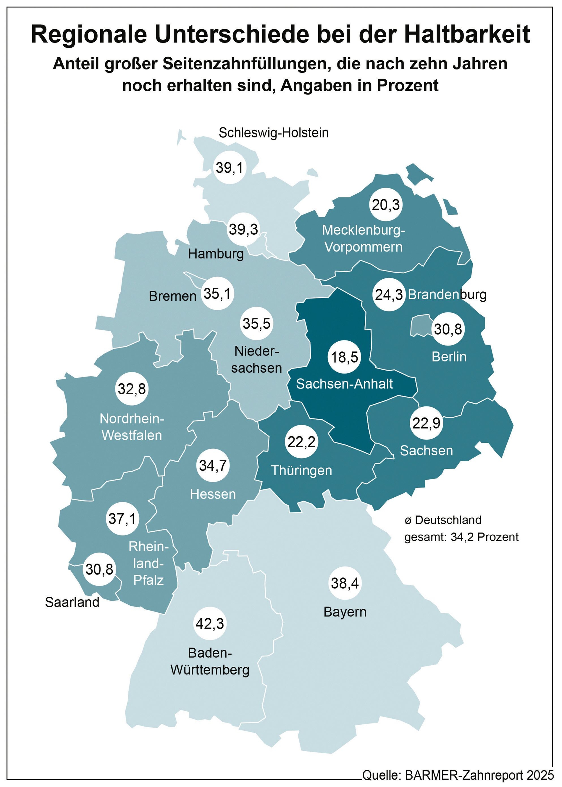 Den Daten der BARMER zufolge gibt es je nach Region jedoch deutliche Unterschiede bei der Liegedauer von Füllungen. So befinden sich in Baden-Württemberg nach zehn Jahren rund 42 Prozent der großen Seitenzahnfüllungen noch im Mund, während es in Sachsen-Anhalt rund 18 Prozent sind. Der Bundesschnitt bei der Haltbarkeit, auch Liegedauer genannt, beträgt etwa 34 Prozent.