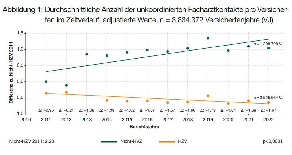 Seit 2011 prüfen die Goethe-Universität Frankfurt und das Universitätsklinikum Heidelberg alle zwei Jahre die Hausarztzentrierte Versorgung (HZV) in Baden-Württemberg. Auch die neueste Evaluation zeigt demnach erkennbare Vorteile dieses Modells im Vergleich zur Regelversorgung, meldet die AOK Baden-Württemberg: So verzeichnete das Modell 2022 zwar etwa 3,1 Millionen Hausarztkontakte mehr, aber auch 1,36 Millionen unkoordinierte Facharztbesuche ohne Überweisung weniger.