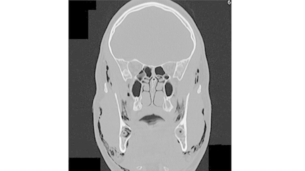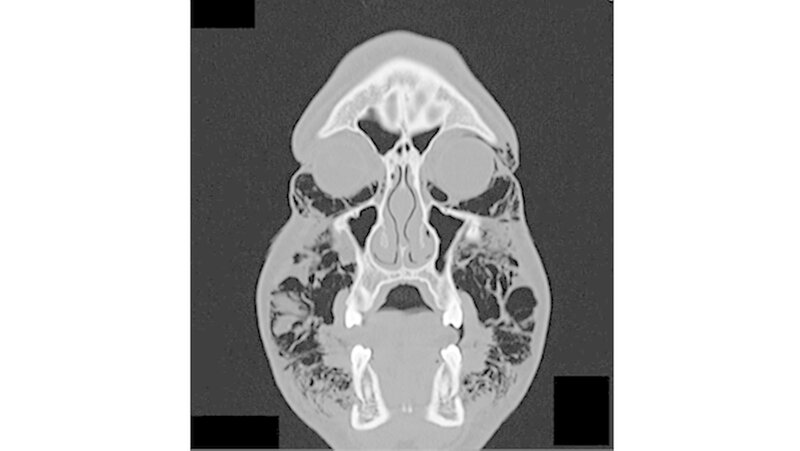 Permanent wiederholte er das Valsalva-Manöver, indem er Atemluft gegen seine verschlossenen Lippen presste. Bei der Aufnahme war der Patient hämodynamisch stabil. Die Funktionen von Nervus facialis sowie Nervus trigeminius waren normal. Auch die Entzündungswerte befanden sich im normalen Bereich. Klinisch war eine umfangreiche Schwellung im gesamten Gesichtsbereich sichtbar. Zudem hatte der Patient Schwierigkeiten, die Augen zu öffnen (Abbildungen 1 und 2).