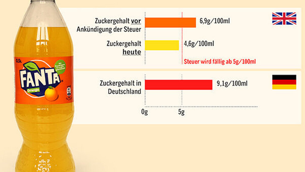 Der britische Marktführer Coca-Cola hat den Zuckergehalt seiner Getränke Fanta und Sprite seitdem unter die 5-Gramm-Marke gesenkt (Fanta von 6,9 auf 4,6 Gramm und Sprite von 6,6 Gramm auf 3,3 Gramm). In Deutschland enthalten Fanta und Sprite aktuell jedoch noch immer mehr als 9 Gramm Zucker.