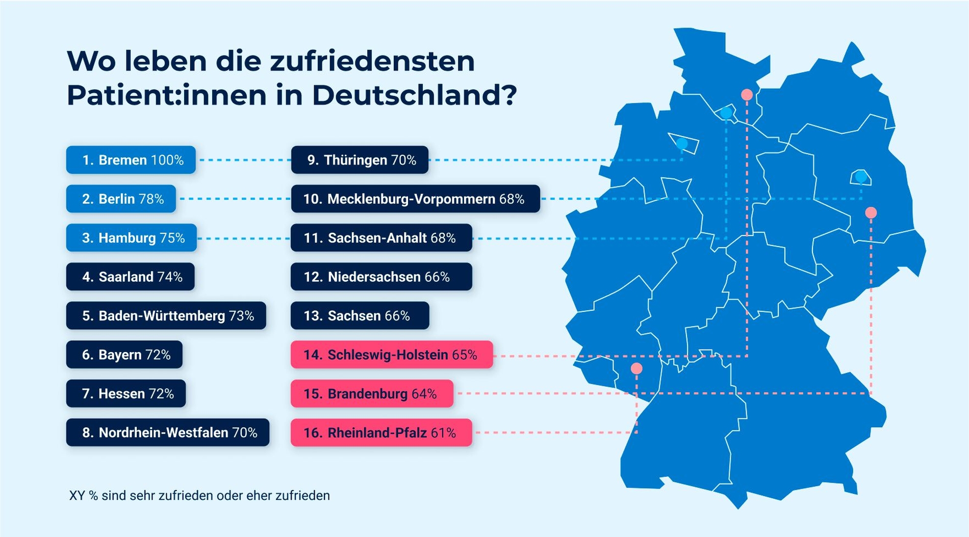 Deutschlandweit sind rund 70 Prozent der Patientinnen und Patienten zufrieden mit der Gesundheit und ihrer Versorgung. Am zufriedensten zeigten sich die Befragten laut Umfrage in den Stadtstaaten Bremen, Berlin und Hamburg. Spitzenreiter Bremen hat 49 Prozent „sehr zufriedene“ und 51 Prozent „eher zufrieden“ Patienten als Einwohner und kommt so auf eine 100-prozentige Zufriedenheit, schreibt Doctolib.