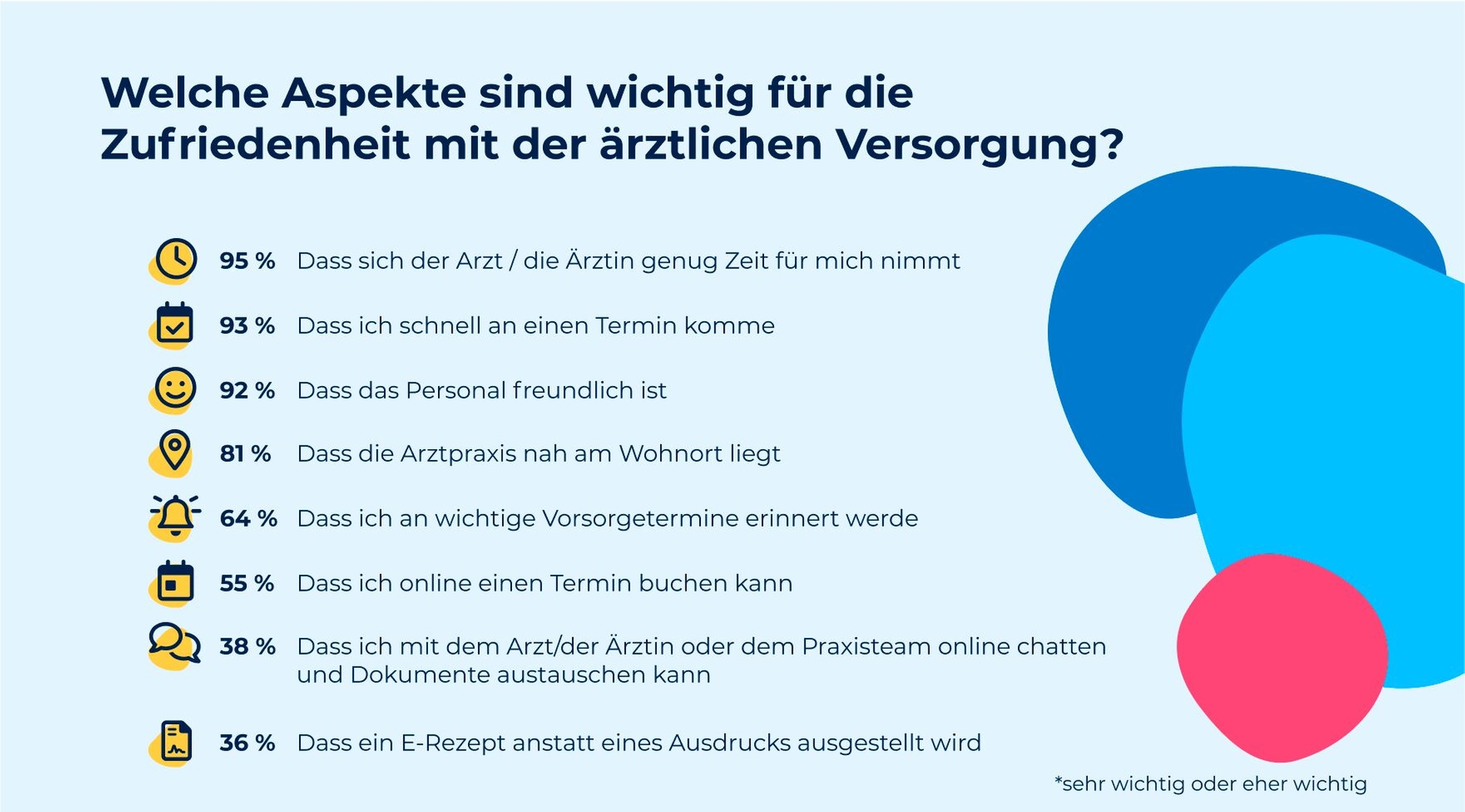 Und was macht die Patienten zufrieden beim Arztbesuch? Es ist vor allem die ausreichende Zeit der Ärztinnen und Ärzte während der Versorgung. Viele Patienten legen besonderen Wert darauf, dass sich der Arzt genug Zeit für sie nimmt. Für insgesamt 95 Prozent ist dieser Aspekt „sehr wichtig“ oder „eher wichtig“. Dass sie schnell an einen Termin kommen, spielt für 93 Prozent eine große Rolle. Freundliches Praxispersonal ist 92 Prozent wichtig und dass die Praxis nah am Wohnort liegt, bewerten 81 Prozent als wichtig hinsichtlich ihrer Gesundheitszufriedenheit.
