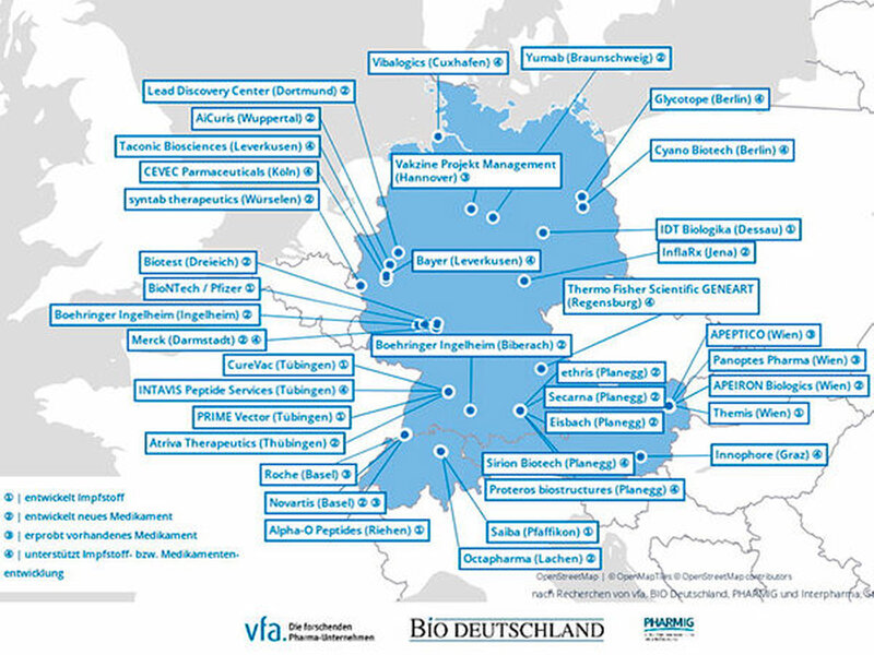 Die Karte beruht auf Recherchen des Verbandes Forschender Arzneimittelhersteller (vfa), BIO Deutschland, PHARMIG und Interpharma (Schweiz) sowie Meldungen der beteiligten Unternehmen und Medienberichten, meldet der vfa. Sie werde laufend ergänzt und aktualisiert, erhebe aber keinen Anspruch auf Vollständigkeit.
