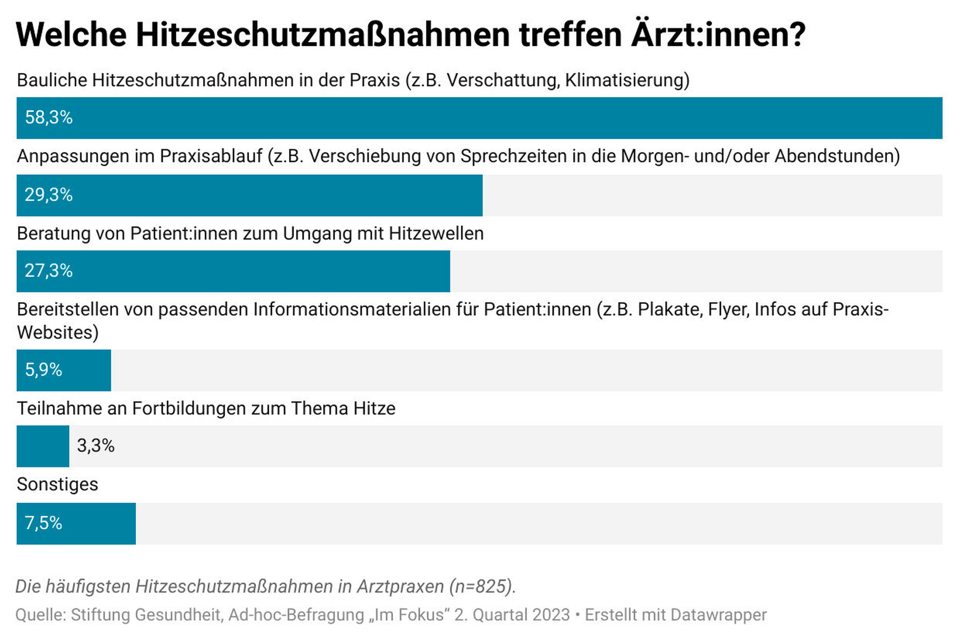 Der Großteil von ihnen setzt beim Hitzeschutz auf bauliche Maßnahmen wie etwa Verschattung oder Klimaanlagen (58,3 Prozent). Mehr als ein Viertel der Befragten passt zudem bei Hitzewellen die Praxisabläufe an und verschiebt beispielsweise Sprechzeiten in die Morgen- und Abendstunden (29,3 Prozent). Ebenfalls mehr als ein Viertel der Ärzte berät Patienten gezielt zum Umgang mit Hitzewellen (27,3 Prozent).