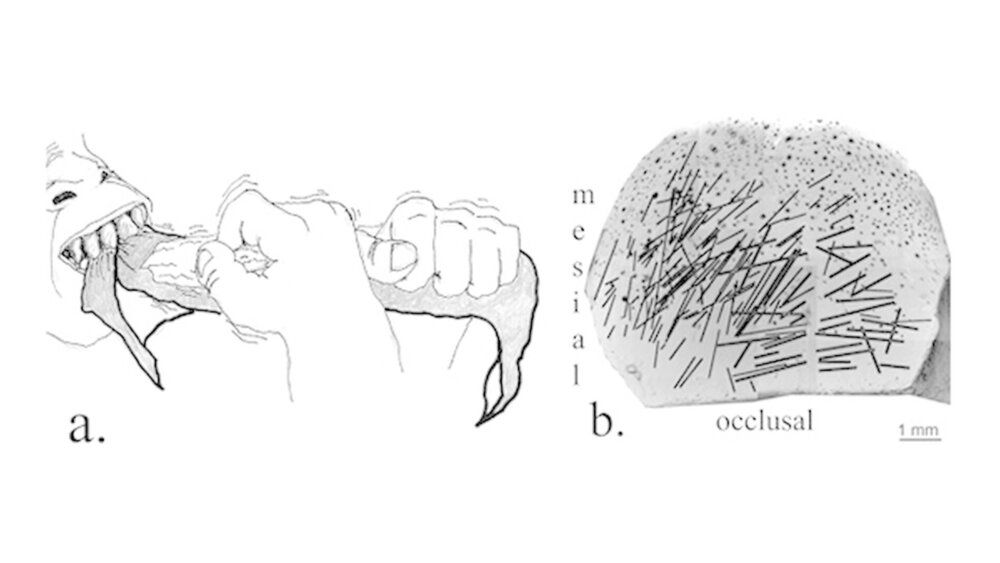 Frayer und sein Team sind nun die Ersten, die in dieser Frage die Zähne zurate zogen: Sie analysierten erstmals die Kratzer auf den Schneide- und Eckzähnen eines Homo habilis. Ihnen kam zupass, dass der Homo habilis seine Frontzähne als "dritte Hand" verwendete, um Gegenstände damit festzuhalten. Und zwar benutzte er seine Zähne quasi als "Schneidebrettchen", indem er sich das Essen zwischen Schneidezähne klemmte und mit der einen Hand aufspannte, um sich dann mit einem Werkzeug in der anderen Hand davon einen Bissen abzuschneiden.