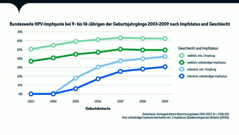 Von den im Jahr 2009 geborenen gesetzlich Versicherten im Alter von 14 Jahren sind 49,5 Prozent der Mädchen und nur 30,6 Prozent der Jungen vollständig gegen HPV geimpft. 62,4 Prozent der Mädchen und 42,2 Prozent der Jungen haben mindestens eine Impfung erhalten.