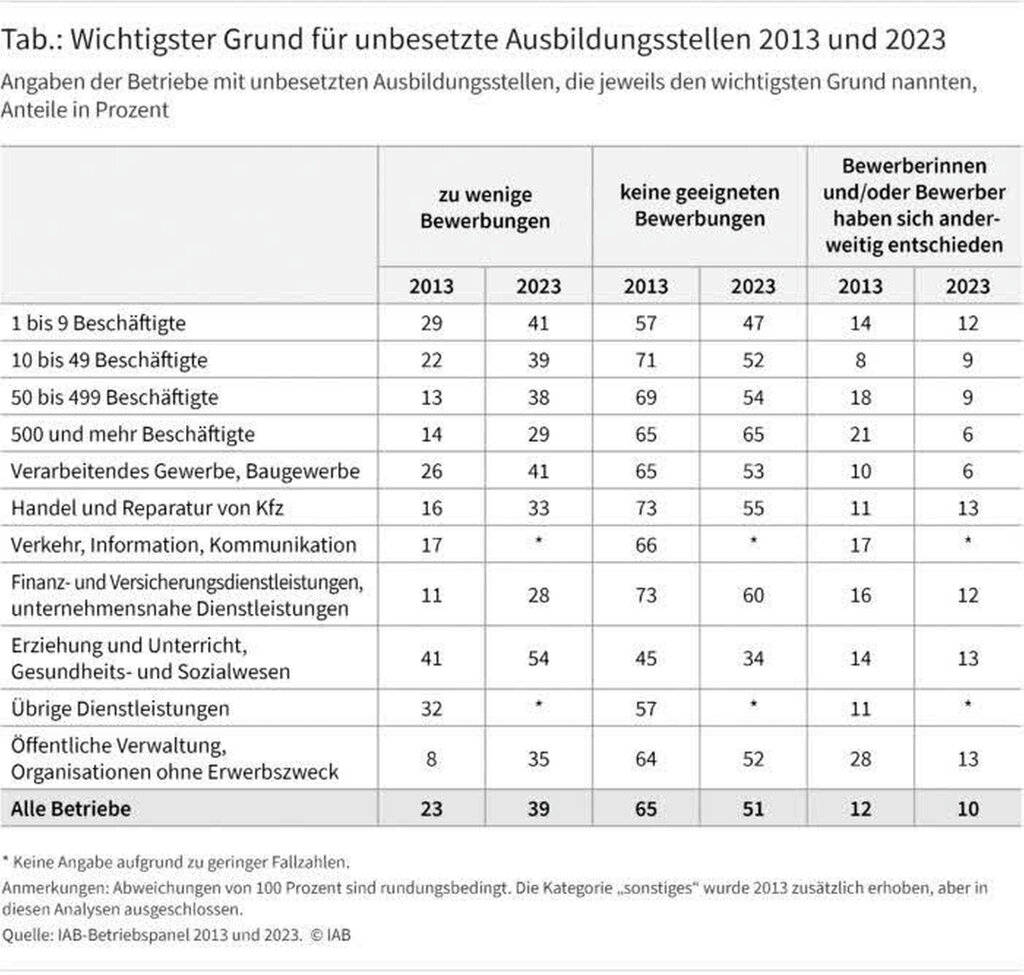 Als Hauptgrund nennen die befragten Betriebe den generellen Mangel an geeigneten Bewerbungen: Gab 2013 rund jeder dritte Betrieb mit unbesetzten Ausbildungsplätzen an, dass sich nicht genug Personen auf die angebotenen Ausbildungsstellen beworben haben, waren es 2023 mit 57 Prozent mehr als die Hälfte.