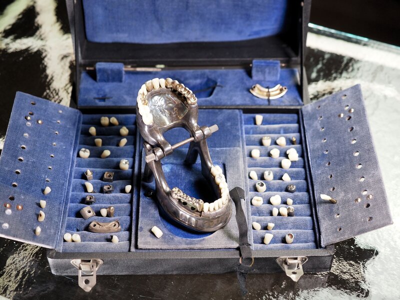 Das Inventar der Koffer-Schaukästen zeigt nicht nur die Möglichkeiten der Patientenaufklärung, sondern spiegelt auch den Stand der Zahnheilkunde ihrer jeweiligen Zeit wider. „Ich kann Ihnen eine Schwebebrücke machen, oder eine mit Porzellanzähnen.“ Beim Inlay gab es die Wahl zwischen Amalgam, Zement, Glas oder Porzellan; den neuen Zahn aus Stahl, Kautschuk oder Gold? Verschiedene Kronen- und Brückenkomponenten, Geschiebe, Gussplatten, Prothesen, Dolder-Stege. Partielle Zähne, kranke Zähne, angebrochene Zähne. Ich packe meinen Koffer und nehme mit ..., alles da.
