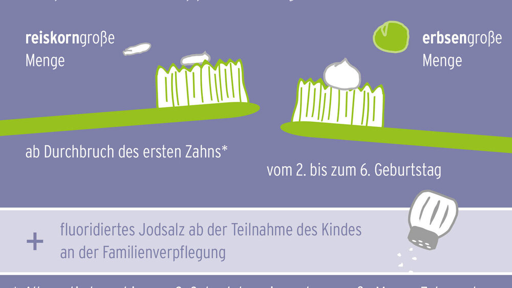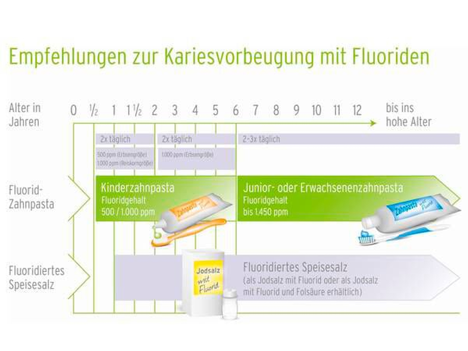 Die Broschüre "Starke Zähne", das mehrsprachige Faltblatt "Gesunde Zähne haben gut lachen" sowie der Patientenblock mit Fluoridfahrplan wurden 2019 nach den neuen Fluoridempfehlungen überarbeitet. Den Anlass dazu gaben zwei aktuelle Entwicklungen: Zum einen haben sich die zahnärztlichen Fachgesellschaften auf die Verdopplung des Fluoridgehalts in Kinderzahnpasten von 500 auf 1.000 ppm verständigt – zusätzlich zur Verwendung von fluoridiertem Speisesalz im Haushalt. Zum anderen können seit Juli 2019 Kinder zwischen dem sechsten und dem vollendeten 33. Lebensmonat drei zahnärztliche Früherkennungsuntersuchungen in Anspruch nehmen.