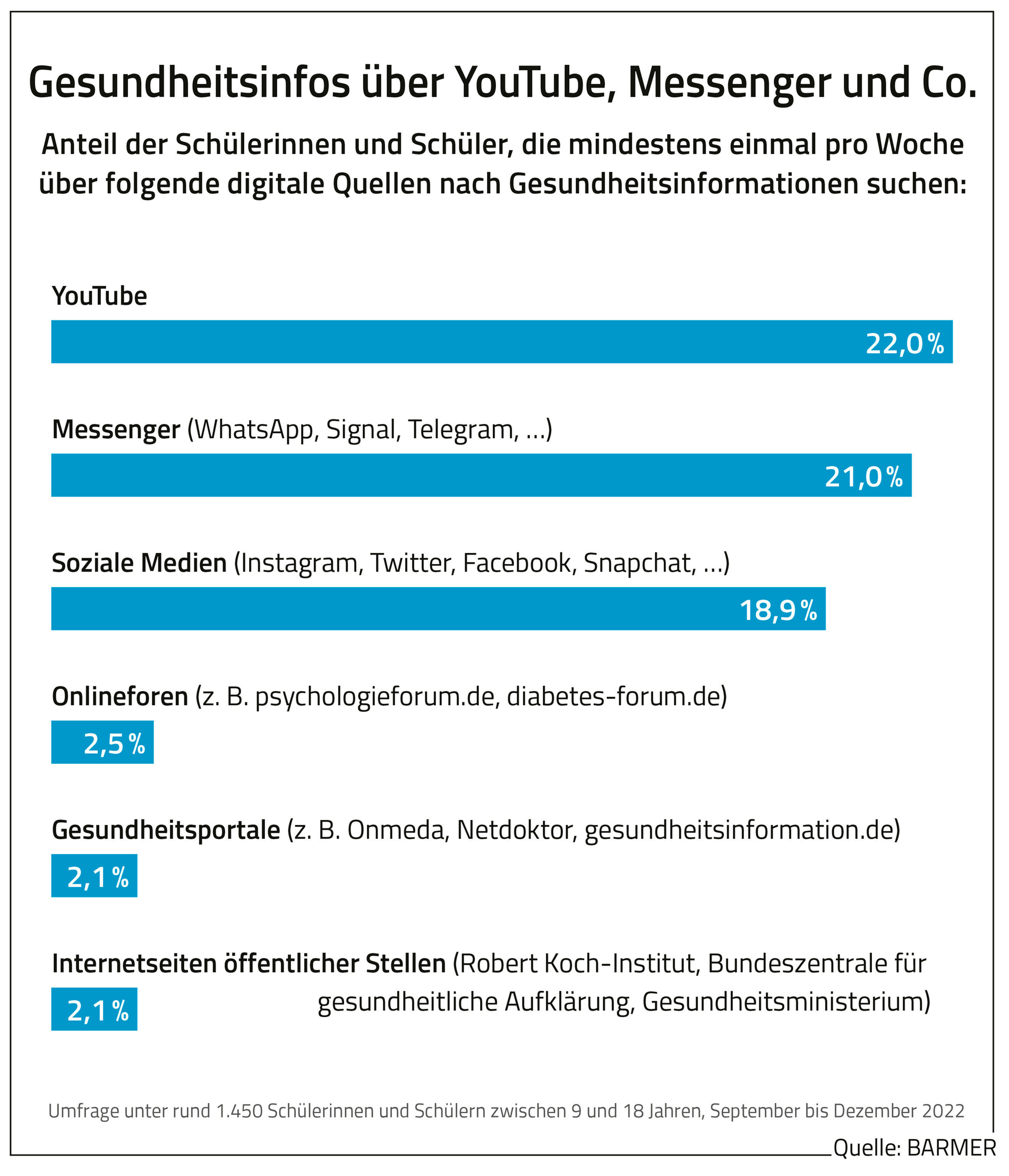 Schülerinnen und Schüler zwischen neun und 18 Jahren nutzen vor allem YouTube, Messenger-Dienste und Soziale Medien, um nach Gesundheitsinformationen zu recherchieren. Das zeigt eine Studie der Technischen Universität (TU) München und Hochschule Fulda in Kooperation mit der BARMER-Krankenkasse. Die Video-Plattform YouTube wird mit 22 Prozent der Nennungen bei der Suche nach Gesundheitsinformationen am stärksten nachgefragt. Beinahe gleichauf sind Messenger-Dienste wie WhatsApp, Signal, Telegram und andere (21 Prozent). Auf fast 19 Prozent der Nennungen kommen soziale Medien wie Instagram, Facebook, Snapchat und Twitter. In Online-Formen, Gesundheitsportalen und an offiziellen Stellen, wie etwa dem Gesundheitsministerium, schauen mit gerade einmal gut 2,1 bis 2,5 Prozent der jungen Menschen.