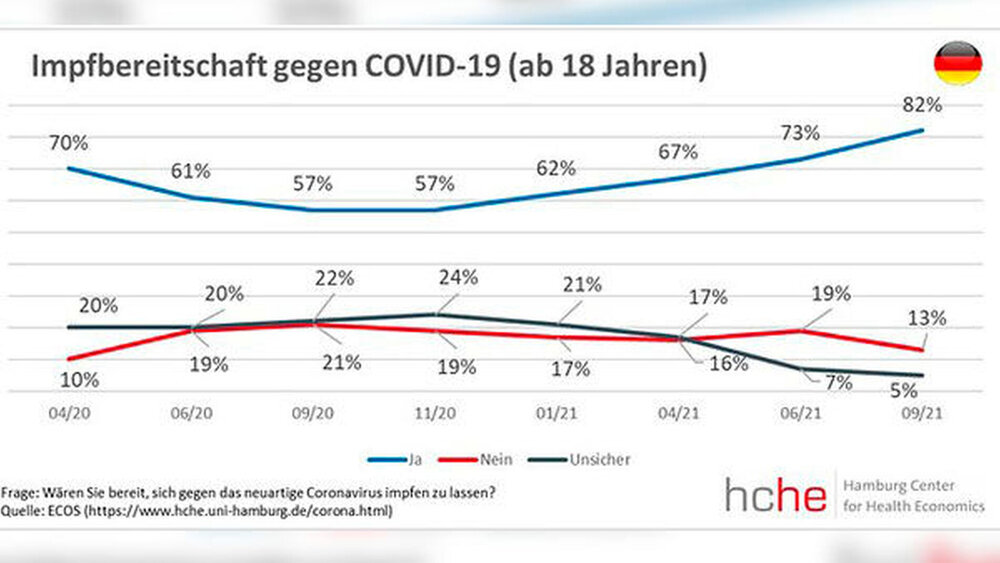 Die Bereitschaft von Eltern, ihre Kinder gegen COVID-19 impfen zu lassen, stieg seit Juni ebenfalls an. Unsicher waren damals 23 Prozent, jetzt sind es 13 Prozent. Der Rückgang könnte auch mit der STIKO-Empfehlung von Mitte August zusammenhängen, heißt es.