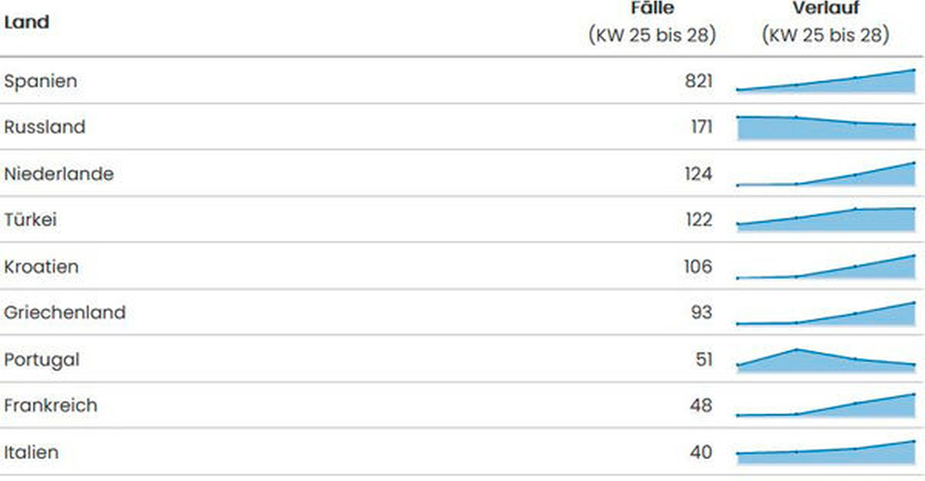 Demnach haben sich mit 821 Infektionen in Spanien die meisten Reiserückkehrer angesteckt. Seit Freitag gilt das Land als Hochinzidenzgebiet und damit für nicht geimpfte Reiserückkehrer eine Quarantänepflicht. Die Inzidenz lag zuletzt bei 385,2, wobei die Kurve der Neuinfektionen steil ansteigt.