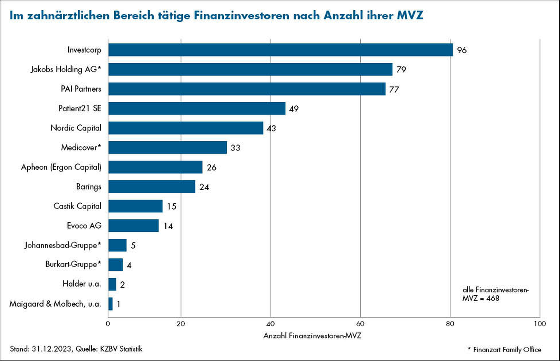 Insgesamt identifizierte die KZBV in der vertragszahnärztlichen Versorgung 14 Groß- und Finanzinvestorengruppen mit 468 iMVZ, darunter zehn Private-Equity-Gesellschaften und vier Family-Office-Gesellschaften. Die Eigentümer- und Beteiligungsstrukturen sind dabei allerdings so verschachtelt und undurchsichtig, das man die Investoren dahinter kaum ausfindig machen kann.