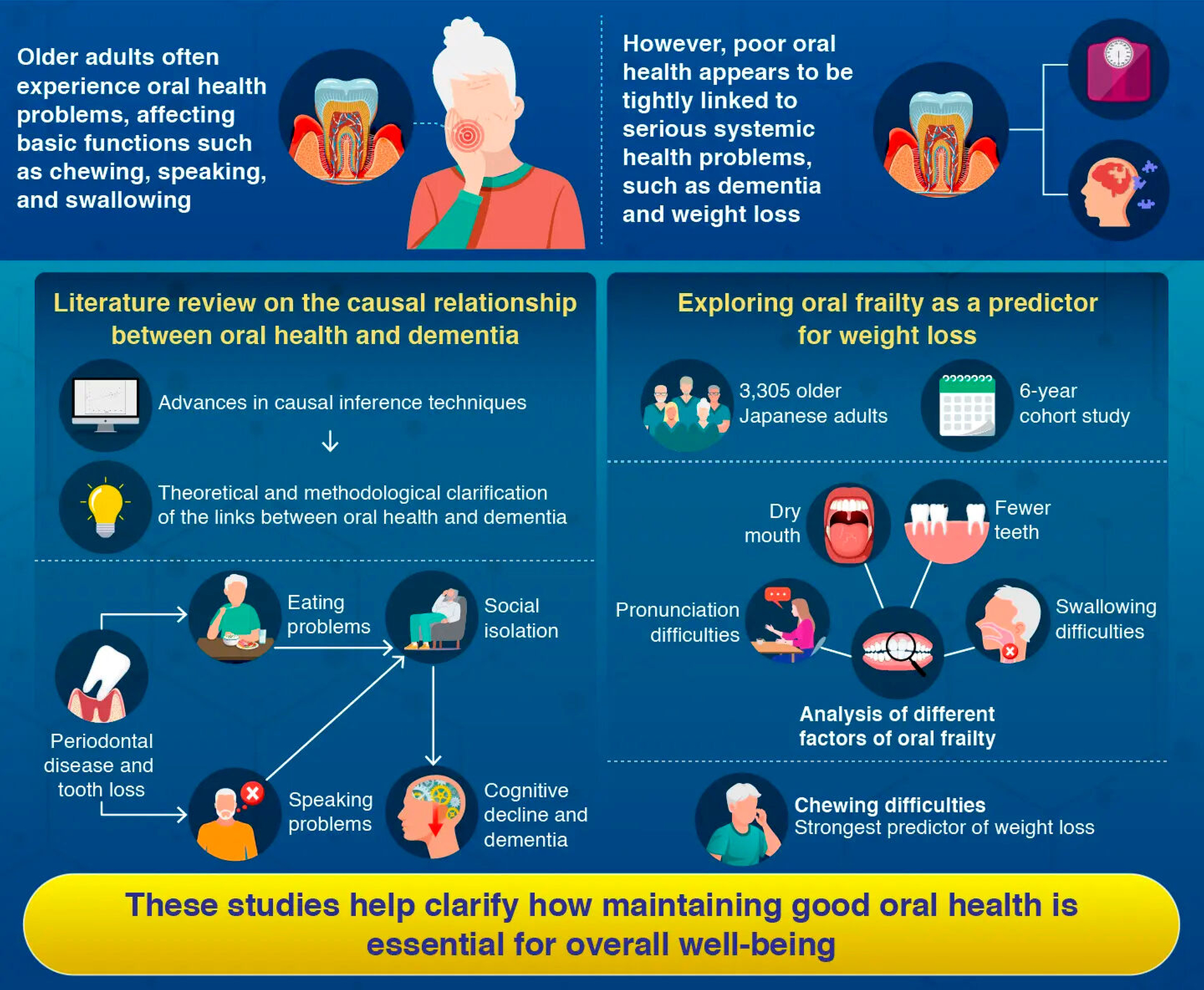 Unter Einbeziehung aktueller epidemiologischer Studien belegen die Forscher, wie Ess- und Sprechschwierigkeiten als bisher übersehene soziale Mechanismen das Risiko einer sozialen Isolation verstärken können. Darüber hinaus fanden sie in einer Längsschnittstudie heraus, dass eine schlechte Mundgesundheit ein starker Prädiktor für Gewichtsverlust bei älteren Erwachsenen ist.