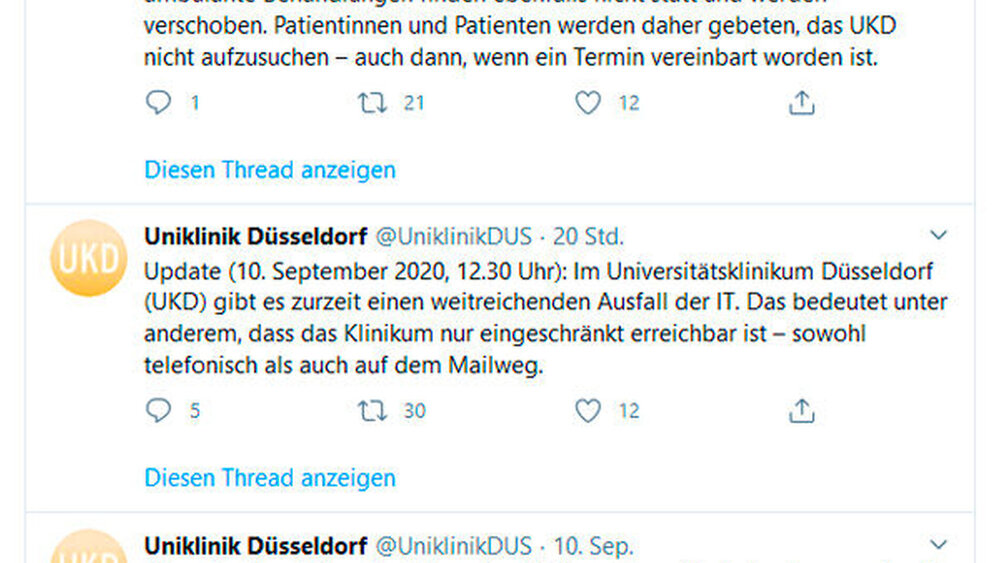 Am 10. September um 3 Uhr nachts war das Computer- und Informationssystem des Uniklinikums weitgehend ausgefallen. Notoperationen wurden noch durchgeführt, anschließend begann die Ursachensuche. Die Zentralstelle für Cybercrime in Köln wurde eingeschaltet, schreibt die Rheinische Post. Man prüfe, ob der Ausfall einen kriminellen Hintergrund hat und ein Angriff auf die kritische Infrastruktur vorliege, sagte ein Sprecher dem Blatt. Die Prüfung habe aber gerade erst begonnen.