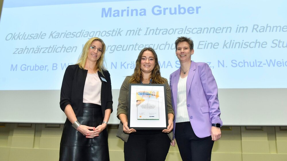 Ihr Fazit: Die visuelle Diagnostik bleibt Goldstandard. Für ihre Postervorstellung während der diesjährigen Jahrestagung der Deutschen Gesellschaft für Kinderzahnmedizin (DGKiZ) wurde Marina Gruber aus der Gießener Arbeitsgruppe mit dem „elmex®-DGKiZ-Präventionspreis für die beste wissenschaftliche Poster-Präsentation auf einer Jahrestagung“ ausgezeichnet.
