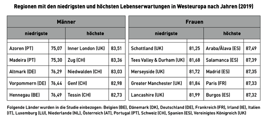 Gleich zwei Regionen in Deutschland sind laut der Studie bei der Lebenserwartung Schlusslichter in Westeuropa: So hatten Männer in der Altmark in Sachsen-Anhalt mit 76,29 Jahren die drittniedrigste und Männer in Vorpommern mit 76,44 Jahren die viertniedrigste Lebenserwartung von allen 450 untersuchten westeuropäischen Regionen. Schlechter schnitten nur noch die über 1.000 Kilometer vom Festland entfernten portugiesischen Inseln Madeira und die Azoren ab.