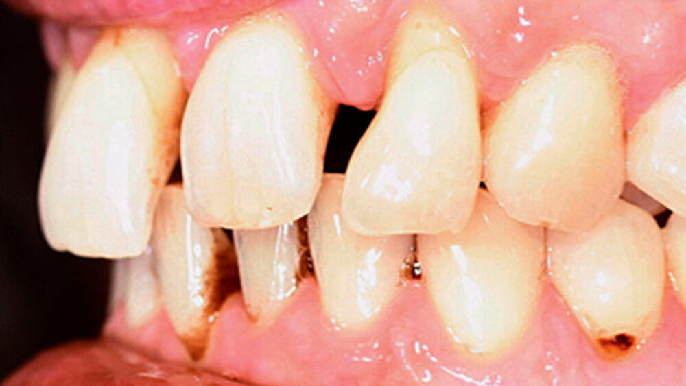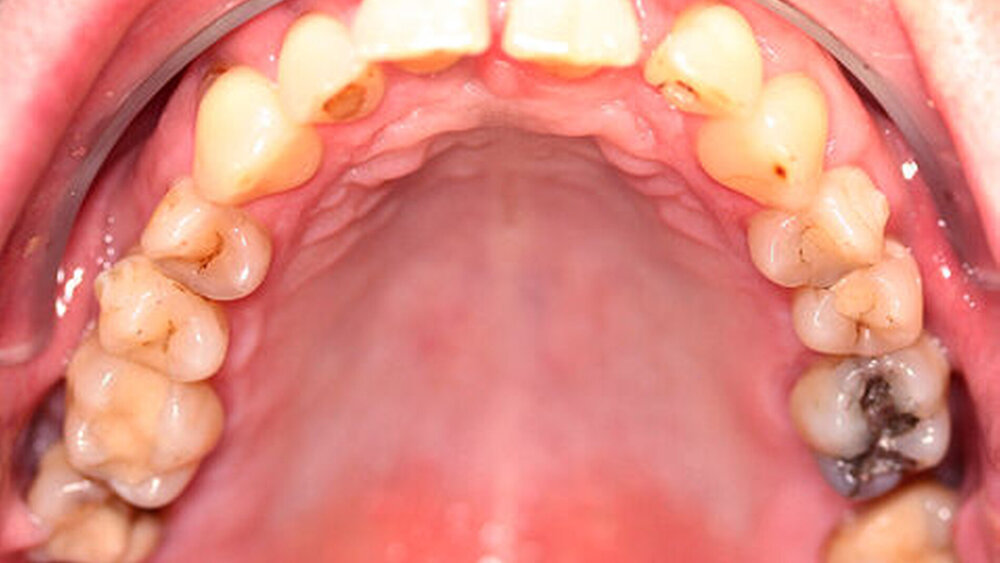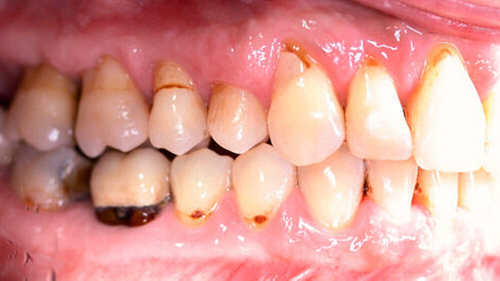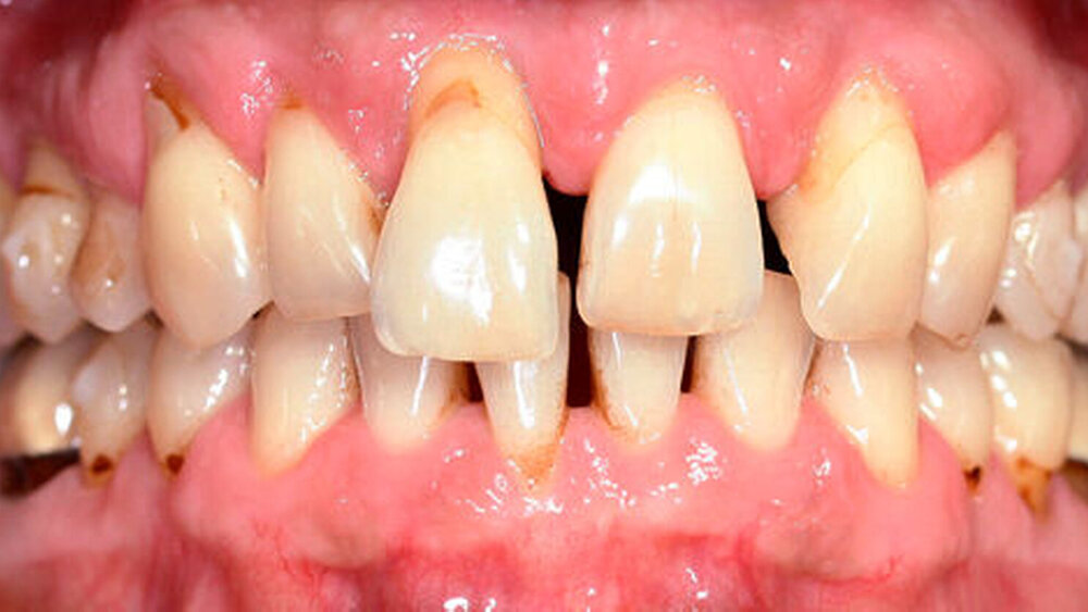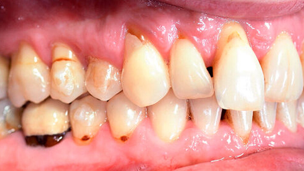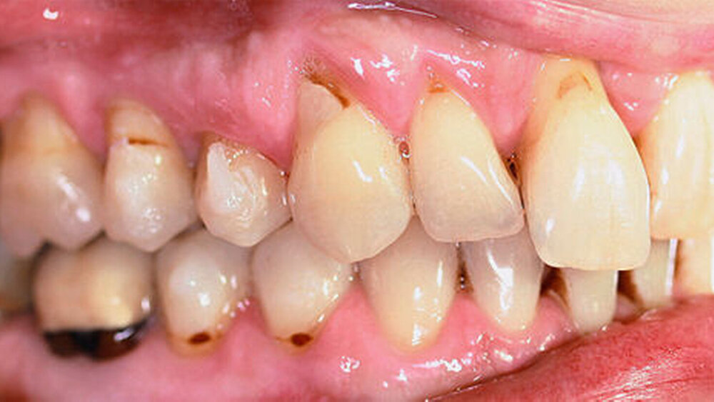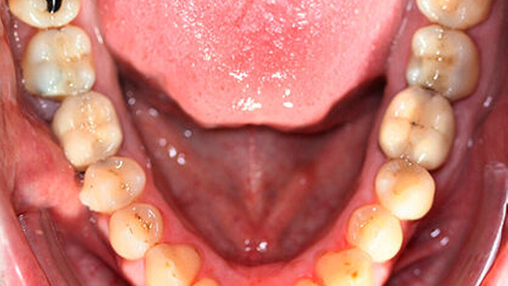 Anamnestisch lagen keine Besonderheiten vor. Es ist jedoch zu vermerken, dass ein regelmäßiger Alkohol-, Koffein- und Nikotinkonsum zugrunde lag. Intraoral zeigte sich ein bereits konservierend versorgtes permanentes Gebiss mit aktivem und inaktivem kariösen Geschehen. Große Anteile der Zahnhälse lagen nach Zahnfleischrückgang in Kombination mit Knocheneinbrüchen frei. Zahn 27 wurde bereits extrahiert.