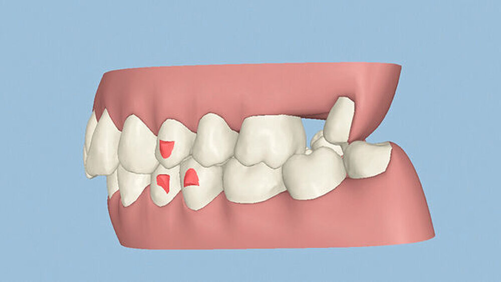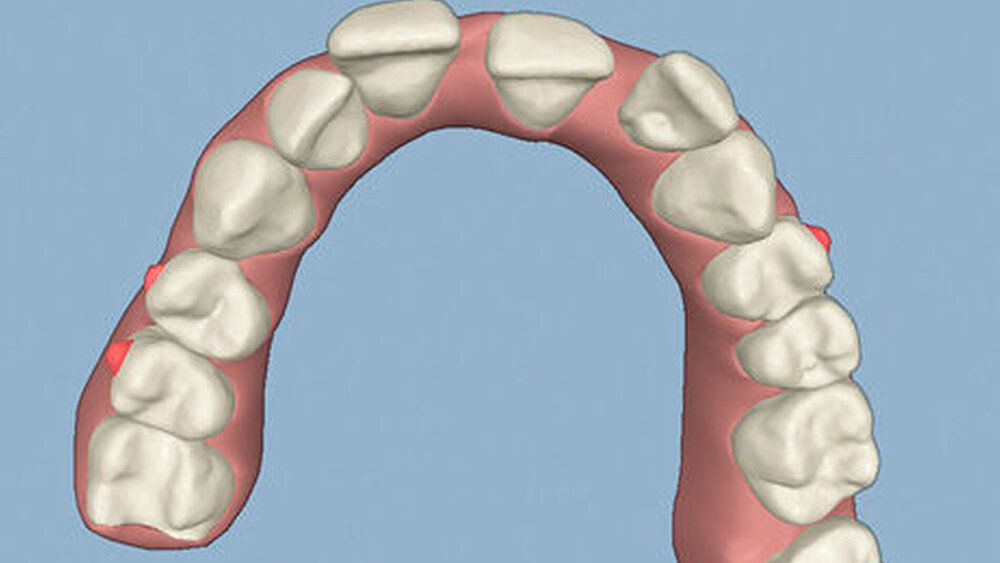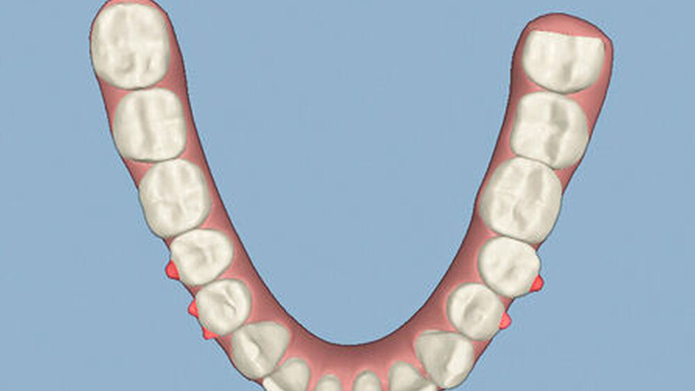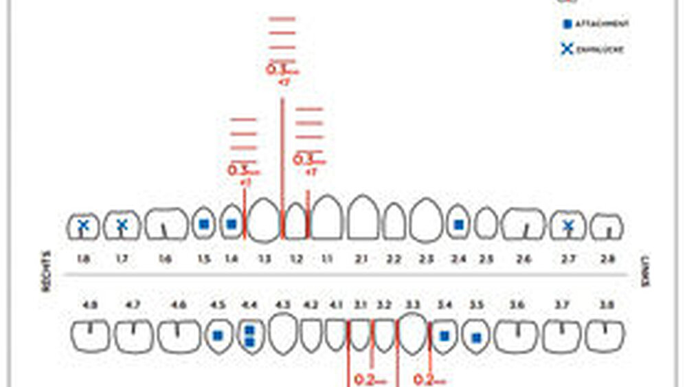 Die Sulkustiefen konnten auf etwas weniger als 4 mm reduziert werden, während der Blutungs- und Plaque-Index bei weniger als 15 Prozent lag. Daher wurde eine kieferorthopädische Behandlung über die nächsten zwei Jahre in Kombination mit engen zahnärztlichen Kontrollen geplant. Als Mittel der Wahl entschieden wir uns gemeinsam mit dem Patienten für das Invisalign-System, da hiermit sowohl eine Schienung als auch eine kraft-arme Bewegung der Zähne möglich sein sollte. Für den Frontzahnbereich wurden keine Attachments geplant, so dass hier eine unnötige Hebelwirkung umgangen werden konnte (Abbildung 3).