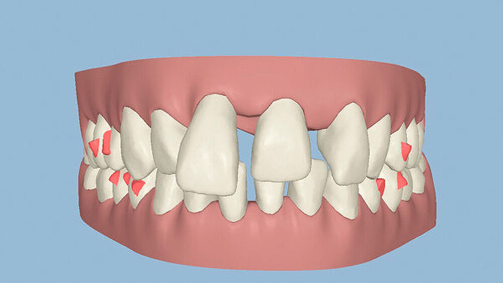Kieferorthopädisch imponierte beidseits eine neutrale Verzahnung bei einem tiefen Biss von 5 mm – bedingt durch die Verlängerung beider Frontzahngruppen. Besonders Zahn 11 zeigte eine erhebliche Verlängerung und Protrusion mit einer sagittalen Frontzahnstufe von 5 mm. Sowohl die Frontzähne im Ober- als auch im Unterkiefer wiesen eine lückige Beziehung zueinander auf (Abbildung 1).