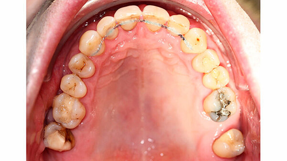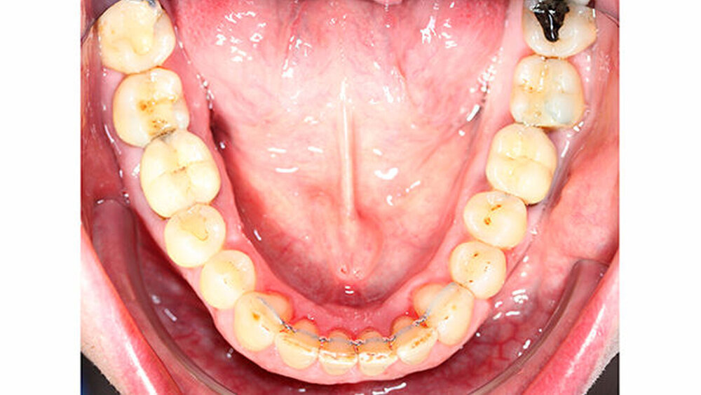 Nach Ausgliederung der insgesamt 14 Invisalignschienen, die der Patient jeweils drei Wochen getragen hatte, wurden ihm sowohl im Unter- als auch im Oberkiefer Sechs-Punkt-Retainer eingegliedert, um eine Schienung und Stabilisierung der Zähne untereinander zu ermöglichen. Zusätzlich wurden für die Nacht Retentionsschienen gefertigt.