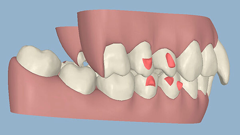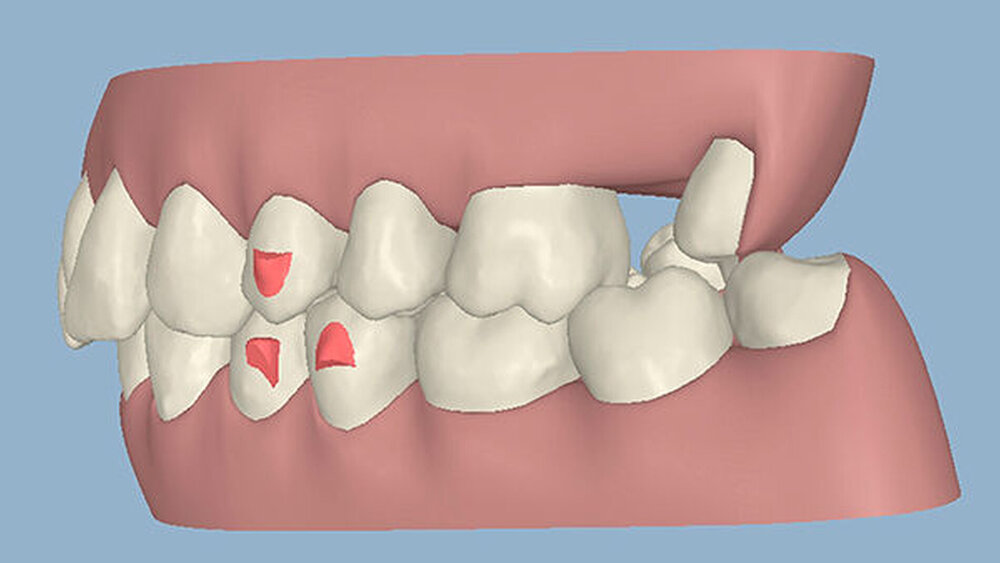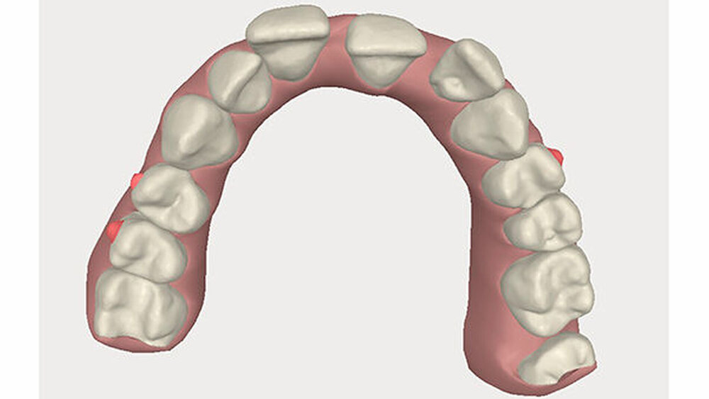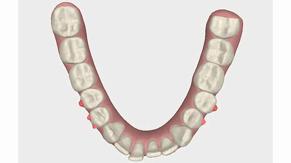 Die Sulkustiefen konnten auf etwas weniger als 4 mm reduziert werden, während der Blutungs- und Plaque-Index bei weniger als 15 Prozent lag. Daher wurde eine kieferorthopädische Behandlung über die nächsten zwei Jahre in Kombination mit engen zahnärztlichen Kontrollen geplant. Als Mittel der Wahl entschieden wir uns gemeinsam mit dem Patienten für das Invisalign-System, da hiermit sowohl eine Schienung als auch eine kraft-arme Bewegung der Zähne möglich sein sollte. Für den Frontzahnbereich wurden keine Attachments geplant, so dass hier eine unnötige Hebelwirkung umgangen werden konnte (Abbildung 3).