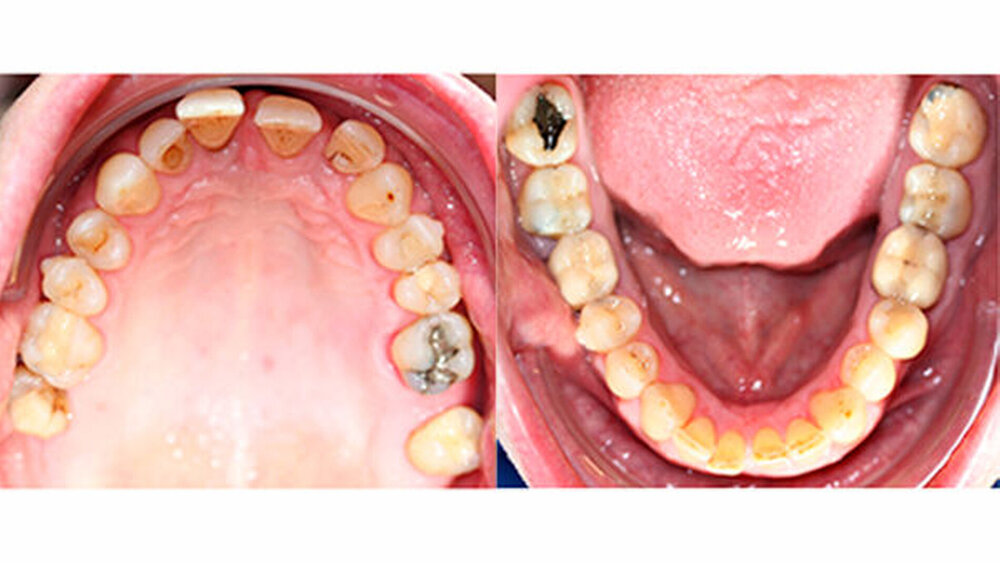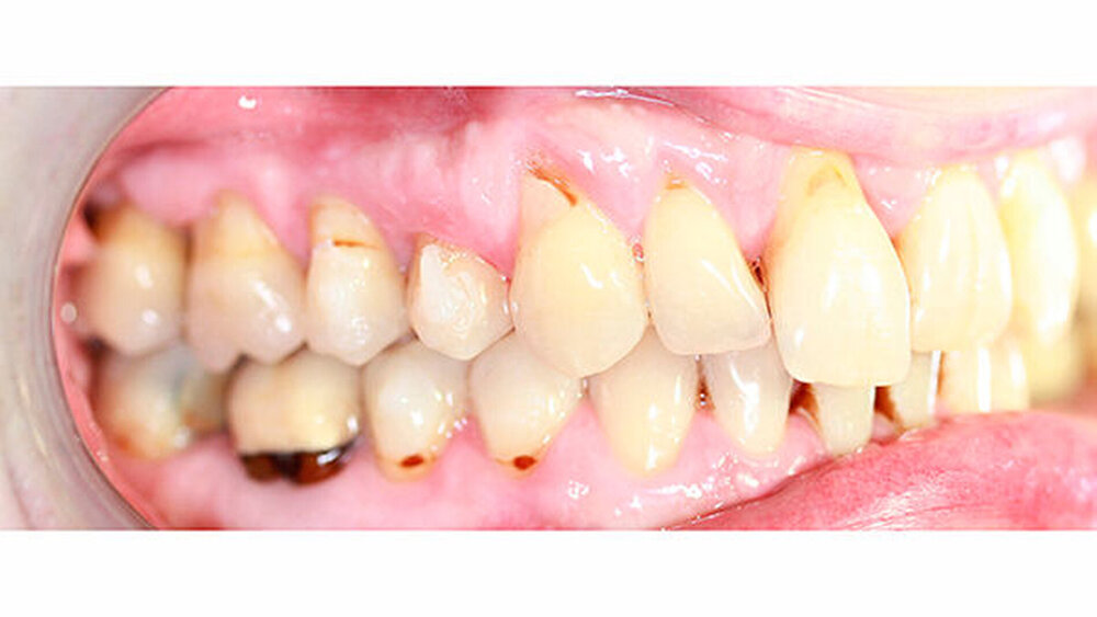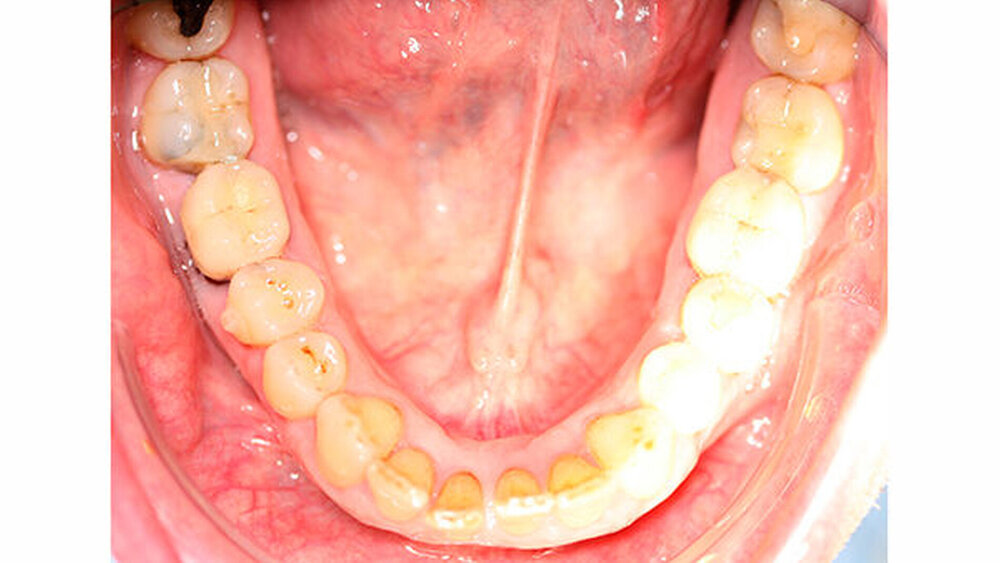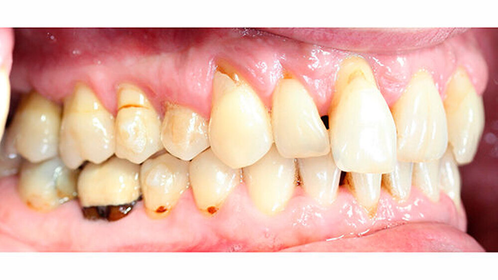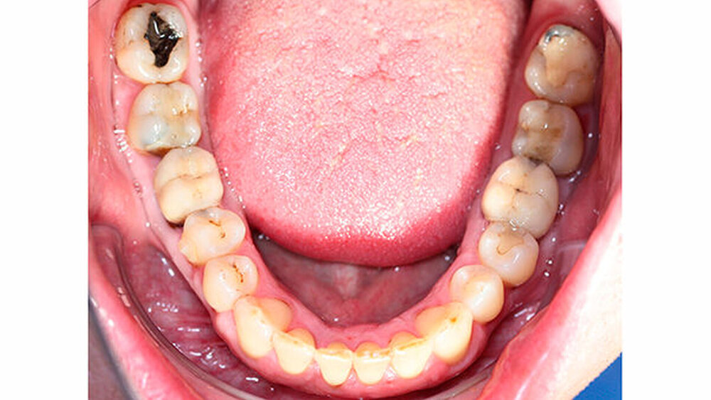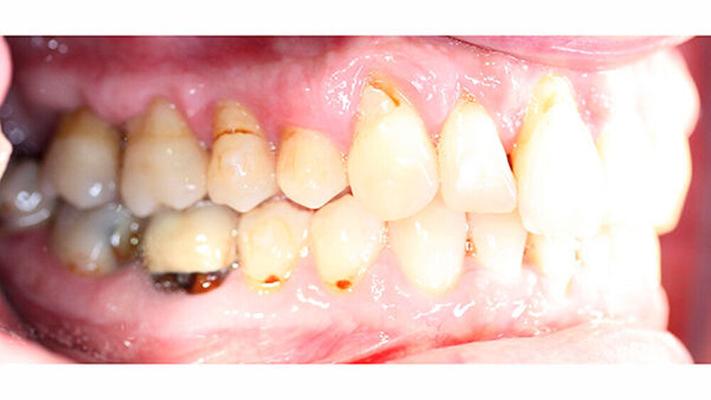 Intraoral zeigte sich ein bereits konservierend versorgtes permanentes Gebiss mit aktivem und inaktivem kariösen Geschehen. Große Anteile der Zahnhälse lagen nach Zahnfleischrückgang in Kombination mit Knocheneinbrüchen frei. Zahn 27 wurde bereits extrahiert.