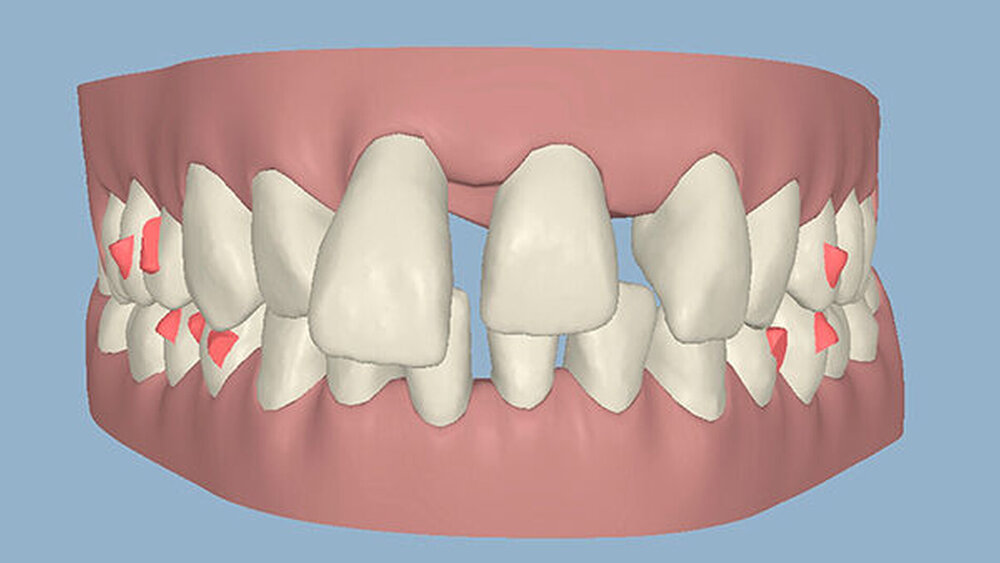 Kieferorthopädisch imponierte beidseits eine neutrale Verzahnung bei einem tiefen Biss von 5 mm - bedingt durch die Verlängerung beider Frontzahngruppen. Besonders Zahn 11 zeigte eine erhebliche Verlängerung und Protrusion mit einer sagittalen Frontzahnstufe von 5 mm. Sowohl die Frontzähne im Ober- als auch im Unterkiefer wiesen eine lückige Beziehung zueinander auf (Abbildung 1).