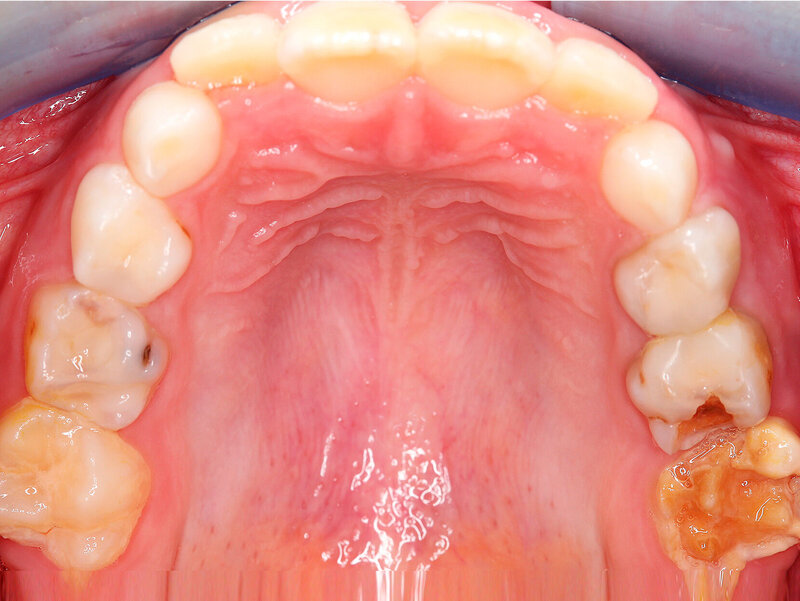 Liegen ein größerer Substanzverlust und massive Hypersensibilitäten vor, kann in frühen Wechselgebissphasen zum Erhalt der betroffenen Molaren als Therapieoption zunächst die Eingliederung einer konfektionierten Stahlkrone als Langzeitprovisorium gewählt werden [Zagdwon et al., 2002] (Abbildungen 21a und 21b). Bei der Präparation sollte der Behandler auf eine möglichst schonende Präparation achten, um genügend Substanz für die spätere, endgültige Versorgung zu belassen. Später kann die Stahlkrone durch eine definitive Krone ersetzt werden. Nach Abschluss der Wechselgebissphase können in Situationen mit einer (nahezu) vollständigen Einbeziehung der Okklusalfläche adhäsiv befestigte laborgefertigte Restaurationen aus verschiedenen Materialien (vorzugsweise Komposit) eine Alternative darstellen [Fayle, 2003], die immer mehr durch die Möglichkeiten der CAD/CAM-Fertigungstechniken [Pfisterer et al., 2017] ergänzt werden (Abbildung 22). Langzeitstudien fehlen allerdings.