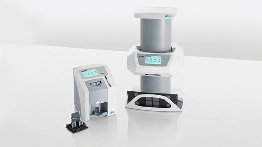 Der Röntgenvorgang mit Speicherfolien ist mit dem Ablauf des analogen Röntgens identisch. Einziger Unterschied: An Stelle des Nassfilms treten die flexiblen Folien. Diese lassen sich im Mundraum des Patienten leicht positionieren und sind schnell digitalisierbar. Durch die vereinfachte und intuitive Bedienung wird Zahnärzten und Kieferorthopäden, die bisher mit Nassfilmen gearbeitet haben, der Umstieg auf ein digitales Gerät erheblich erleichtert. Wenn Praxen neben intraoralen auch extraorale Aufnahmen benötigen, bietet sich der neue VistaScan Combi View an. Als größere Variante des VistaScan Mini View verfügt er über die gleichen Grundfunktionen und digitalisiert intraorale Größen S0 bis S4 sowie große Panorama- und Ceph-Aufnahmen.