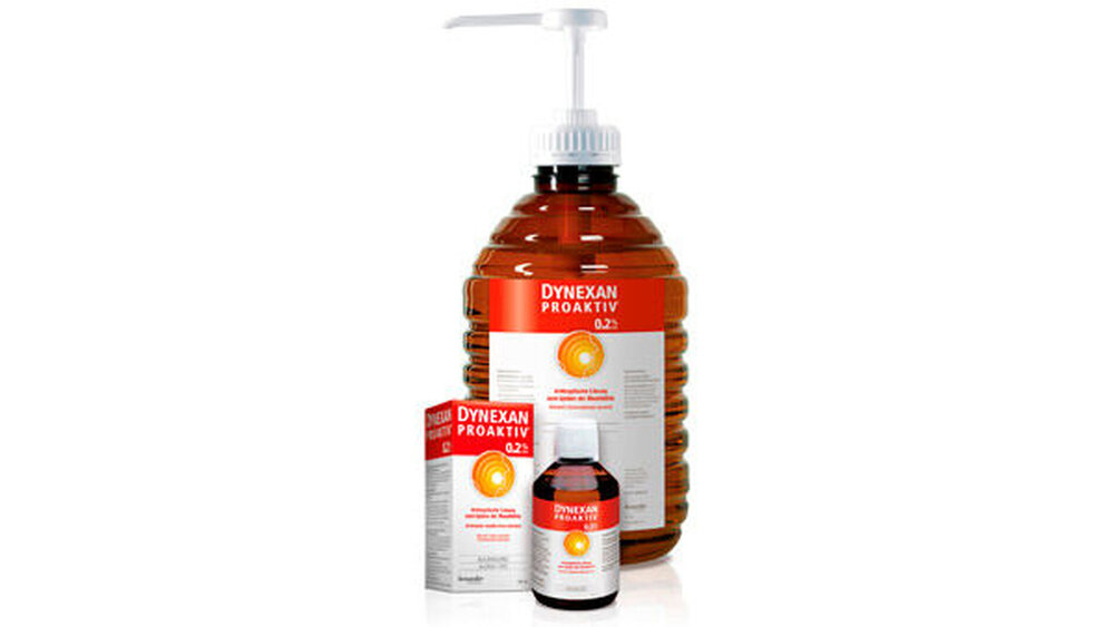 In der Praxis bewährt sich Dynexan Proaktiv 0,2 % CHX in der wirtschaftlichen 5 Liter Großflasche. Die Lösung ist alkoholfrei und ohne Farbstoff, der angenehme Geschmack erhöht die Compliance. Dynexan Proaktiv 0,2 % CHX kommt zum Einsatz zum Beispiel vor zahnärztlichen Behandlungen zur gezielten Schleimhaut- antiseptik und Reduktion der Keimbelastung im Aerosol. Weitere Anwendungsmöglichkeiten sind prä- und postoperativ zur Vermeidung einer Bakteriämie, im Rahmen einer Gingivitis- und Parodontaltherapie oder im Rahmen der „Full-mouth disinfection“. Mit der 300 ml PET-Flasche können Patienten die Therapie zuhause fortführen, über den Prophylaxe-Shop darf dieses freiverkäufliche Arzneimittel direkt an den Patienten verkauft werden.