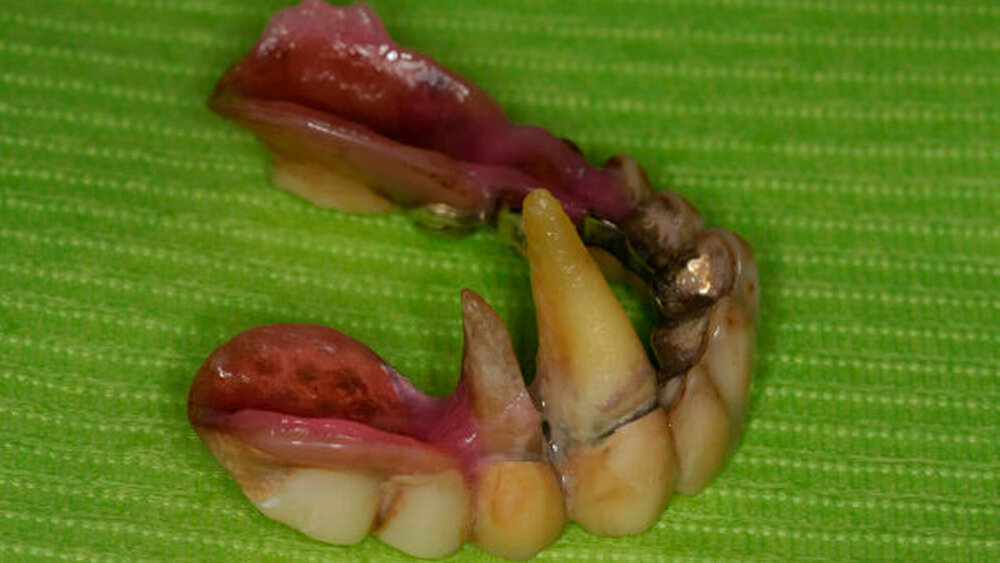 Dr. Frank Schürmann berichtet: "Bei der Kontrolluntersuchung kam die 65-jährige Patientin unserer Bitte, den Oberkieferzahnersatz herauszunehmen, nur zögerlich nach. Der Grund für das Zögern war unmittelbar ersichtlich. Auf Nachfrage erklärte die Patientin, dass dieser Zustand schon über ein Jahr bestünde, sie bisher aber nicht gestört habe. Die intraorale Inspektion ergab mit Schleimhaut sauber ausgekleidete Alveolen. Wir empfahlen unserer Patientin eine prothetische Neuversorgung mit einer Totalprothese. Diese Behandlung ist mittlerweile zur Zufriedenheit der Patientin erfolgt."