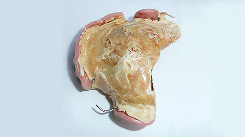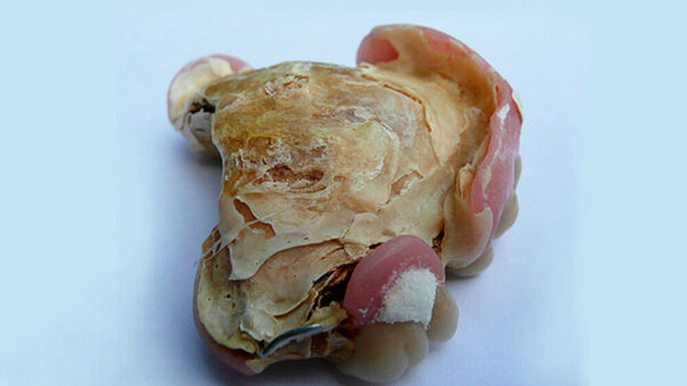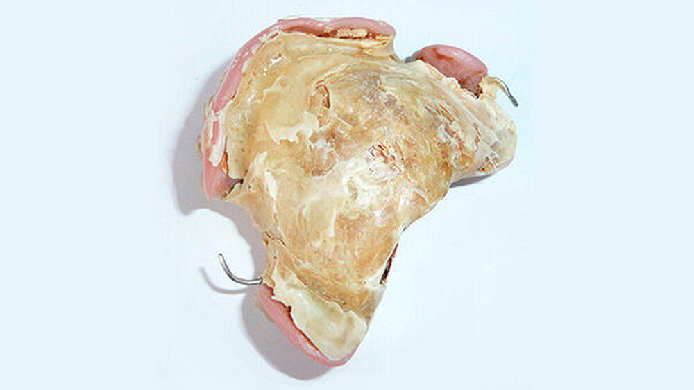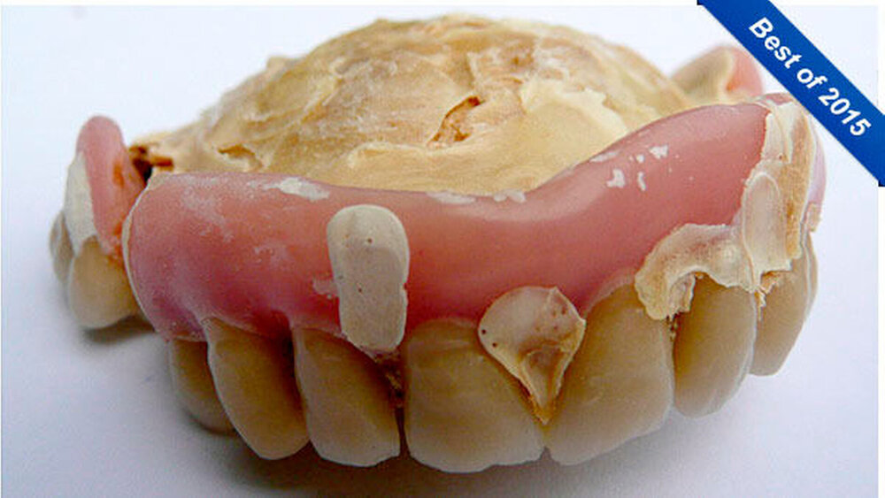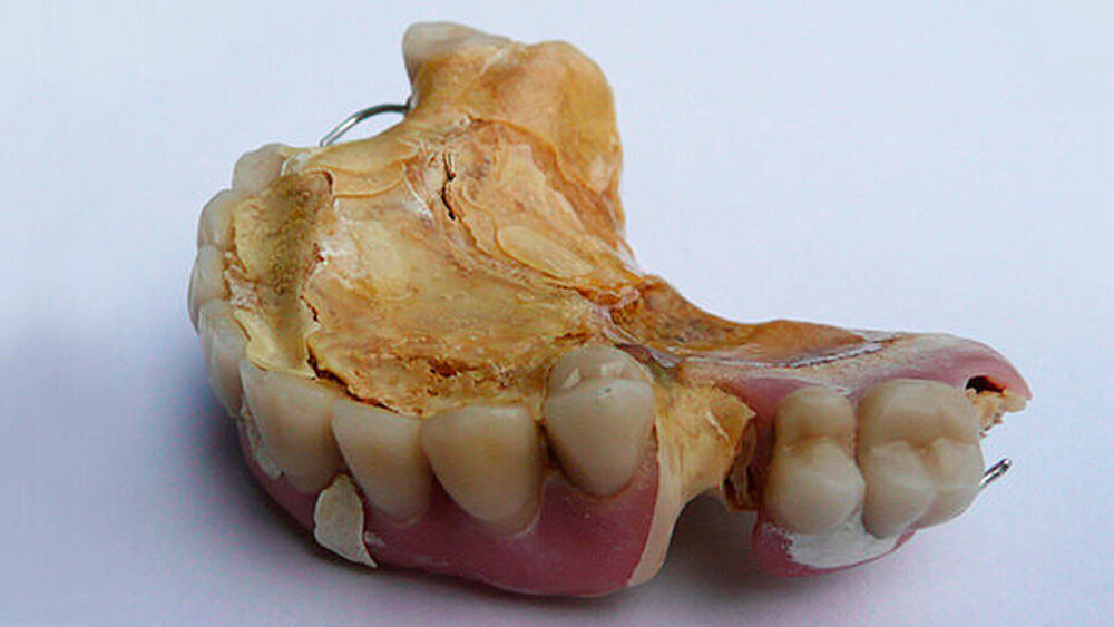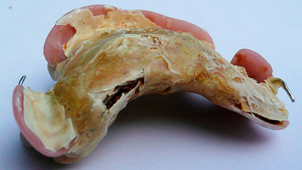 Diese Prothese ist auch für Archäologen interessant: Man sieht unzählige Kleberschichten, die der Patient aufgebracht hatte. Die Härtung erfolgte dann im Mund. "Anscheinend ist die toxikologische Wirkung von Pattex nicht allzu groß", schreibt uns Dr. Markus Henkel.