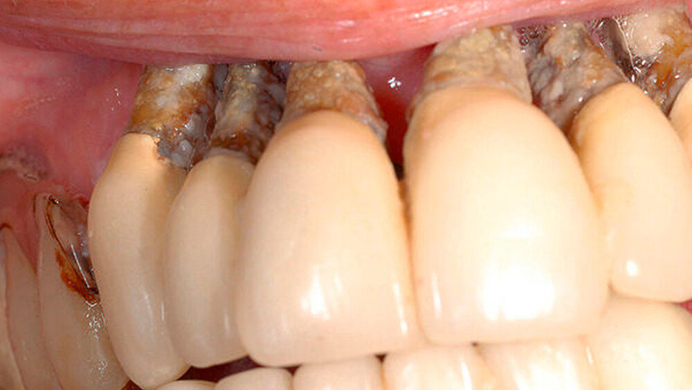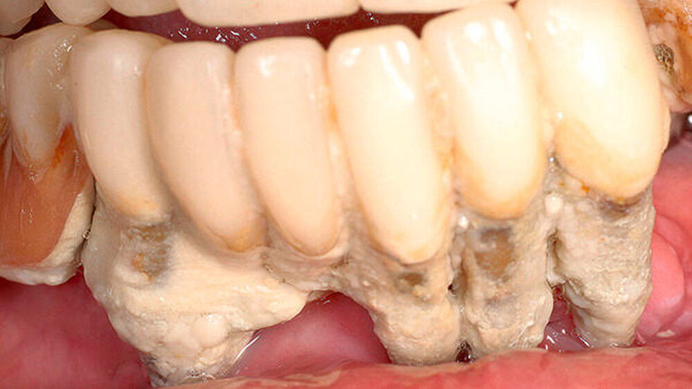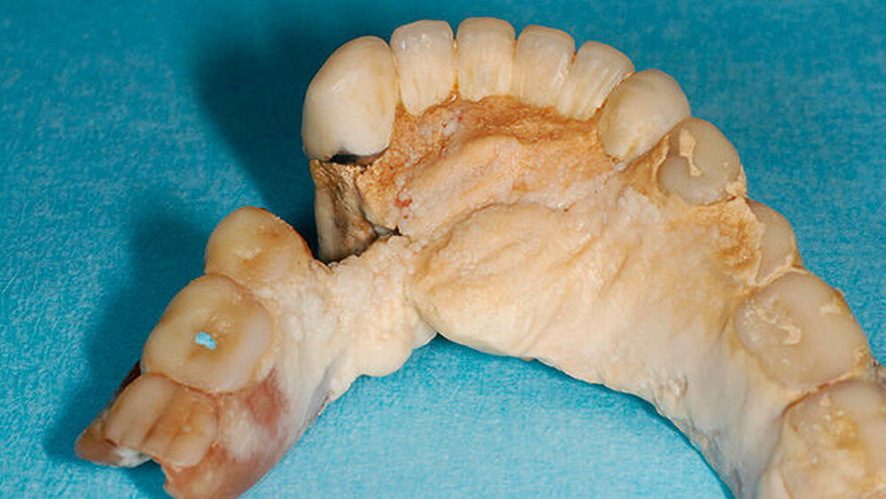 Die 51-jährige ansonsten sehr gepflegte Patientin litt unter einer Zahnarztphobie. Seit Jahren hatte sie beide Prothesen nicht mehr aus dem Mund herausgenommen, weil sie wusste, dass dabei die Zähne immer gleich mit "herauskamen". Die Alveolen waren mittlerweile auch schon geschlossen, die natürlichen Zähne standen in Mulden vor dem Alveolarkamm. Die Patientin wurde zunächst mit einer Interims-Totalprothese versorgt.