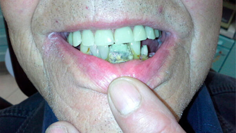 Die "Prothese" ist nur in einer Einschubrichtung entfernbar, hält Wind und Wetter stand und gewährleistet eine gute Kaufähigkeit bis hin zu Äpfeln, Möhren und Nüssen. Der Patient ist ein attraktiver und fröhlicher Mittsechziger, ansonsten sehr eitel. In diesem Fall hatte ihn nur gestört, dass er nach dem Anfertigen dieses Schmuckstücks zwei Wochen lang mit gerötetem, geschwollenem und schmerzhaftem Ausschlag im Gesicht herumlaufen musste."