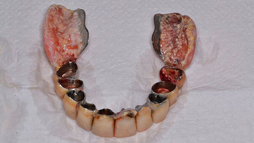 Als sein behandelnder Zahnarzt konnte ich ihn überzeugen, dass es sinnvoll sei, die obere Teleskop-Prothese täglich zur Reinigung herauszunehmen. Ich machte mich auf das Schlimmste gefasst und bekam dann den unten abgebildeten Zahnersatz zu sehen. Dieser musste intensiv gereinigt werden. Die Zähne waren jedoch alle intakt, und die Arbeit wurde wieder eingegliedert. Der Patient wurde daraufhin wöchentlich einbestellt und die Handhabung und Reinigung mehrfach gemeinsam geübt. Seither ist alles in einem akzeptablen Zustand."
