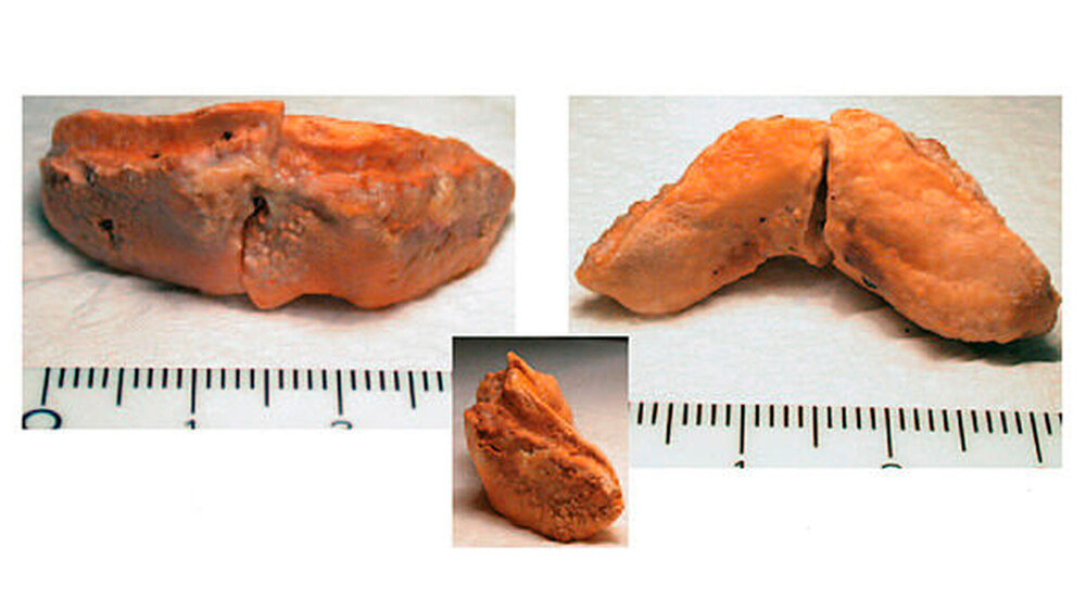 Nach dem schmerzhaften Entfernen der sehr fest sitzenden Prothese mit Hebelkraft stach im Sublingualbereich hinter der Unterkieferfront ein seltsames Gebilde hervor. Nach Entfernen dieses im Mundraum verkanteten Teils erkannte ZA Jost Jahn, dass man das Zahn-"Stein" durchaus wörtlich nehmen kann.