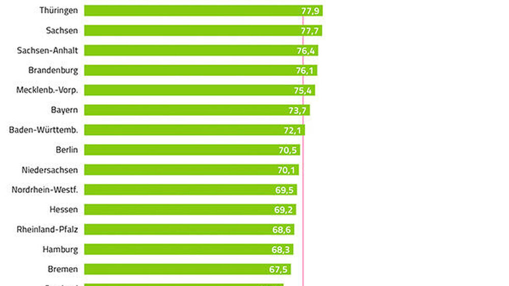 Die Thüringer nehmen hingegen die Spitzenposition ein. Hier waren es 77,9 Prozent, die zum Zahnarzt gegangen sind, gefolgt von den GKV-Versicherten aus Sachsen (77,7 Prozent), Sachsen-Anhalt (76,4 Prozent), Brandenburg (76,1 Prozent) und Mecklenburg-Vorpommern (75,4 Prozent).