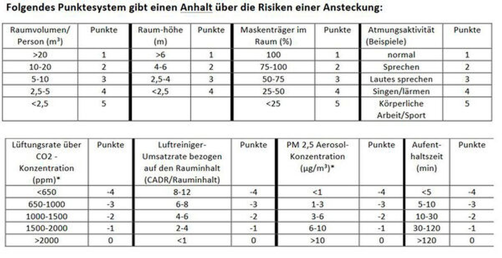 Der Leitfaden berechnet anhand von Parametern, wie Personenzahl, Aufenthaltsdauer, Raumhöhe und -größe, Lüftung oder Luftreinigung, Maskenverwendung und Atemfrequenz, das Infektionsrisiko in Innenräumen.