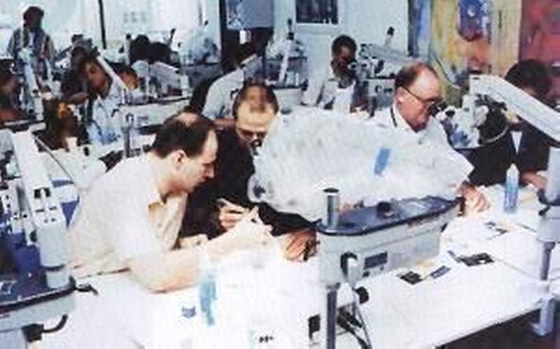 Es ist nicht damit getan, sich eine Lupenbrille oder gar ein Mikroskop zum Test auszuleihen und sofort mit einer Präparation oder einem chirurgischen Eingriff zu beginnen [12], denn es ist dringend notwendig, sich erst langsam und dabei systematisch mit unterschiedlichen Arbeitsaufgaben an die Anwendung der vergrößernden Sehhilfen zu gewöhnen [12, 15, 38]. Gleiches gilt für den Einsatz der Videokamera [38]. Beispielhaft sind die von Carl Zeiss in Oberkochen veranstalteten Symposien, bei denen die Fabrikate dieser Firma ausprobiert und erlernt werden können (Abbildung 8).